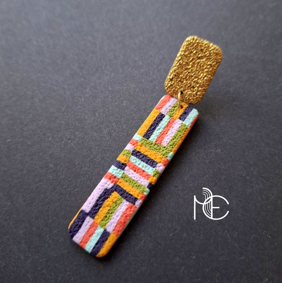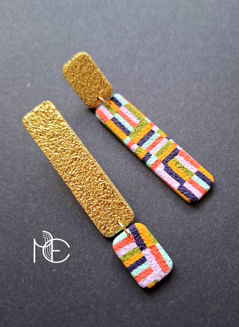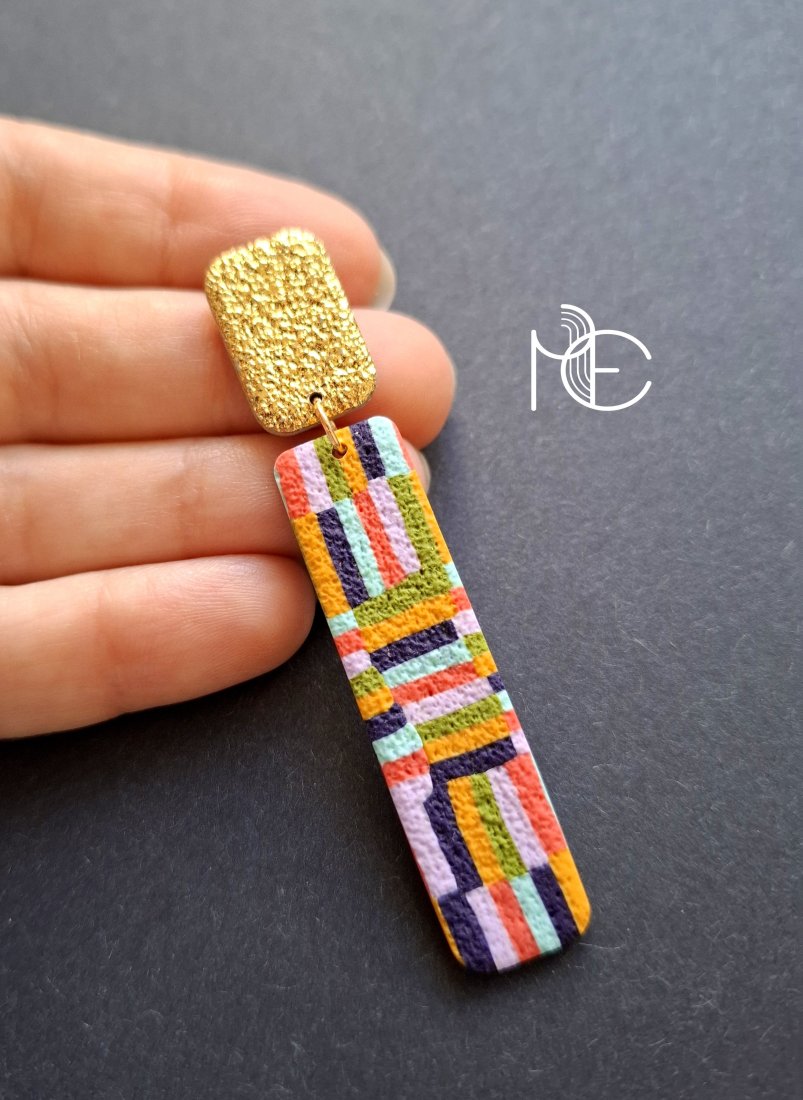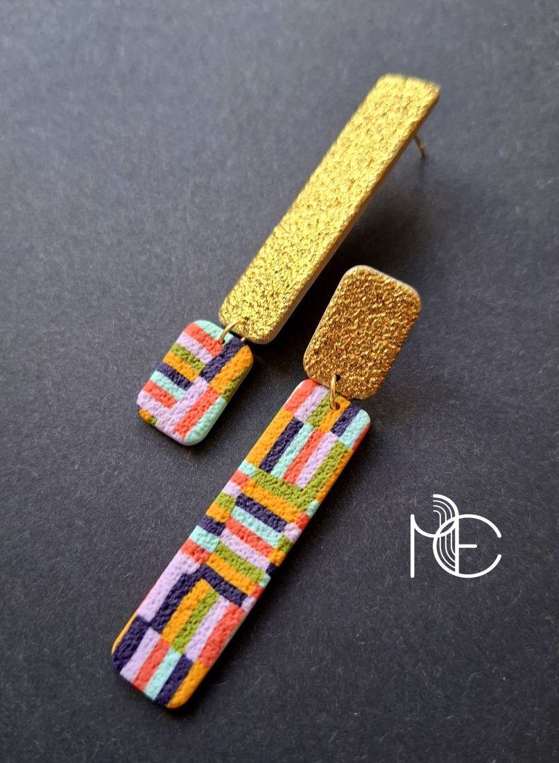 Lekkie kolczyki na sztyfty wykonane z wysokiej jakości glinki polimerowej z efektownym, asymetrycznym wzorem. Jednostronne z pozłacanymi, nieuczulającymi sztyftami. Wymiary: długość wraz z zapięciem: 7,3 cm; szerokość max. 1,3 cm. Wykonane w jedynym egzemplarzu.