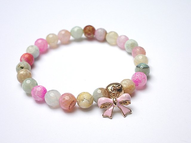 Bransoletka wykonana z kamieni naturalnych - agaty [8mm] oraz elementów w kolorze tzw. różowego złota. Bransoletka na gumce silikonowej. Pasuje na nadgarstek 16-17cm. Biżuteria ozdobnie zapakowana. Możliwość dopasowania bransoletki do nadgarstka - wcześniej prosimy o kontakt.