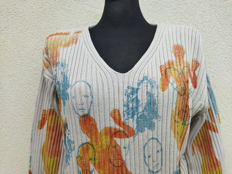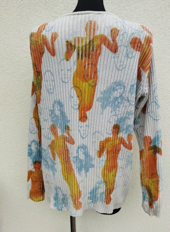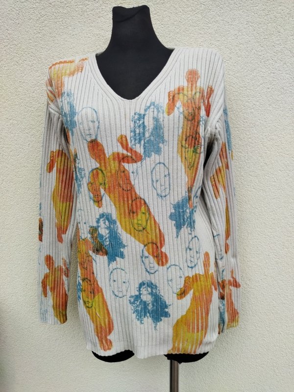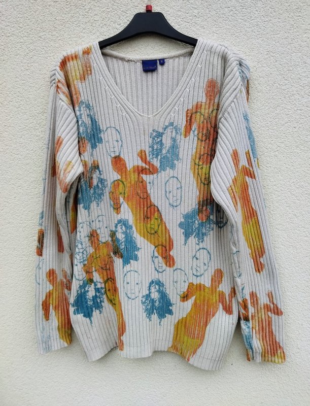 Ciekawy bawełniany sweter w jasnobeżowym kolorze na pograniczu ze złamana bielą malowany farbami w niebieskim i pomarańczowo- rudo-żółtym kolorze . Podatny i rozciągliwy