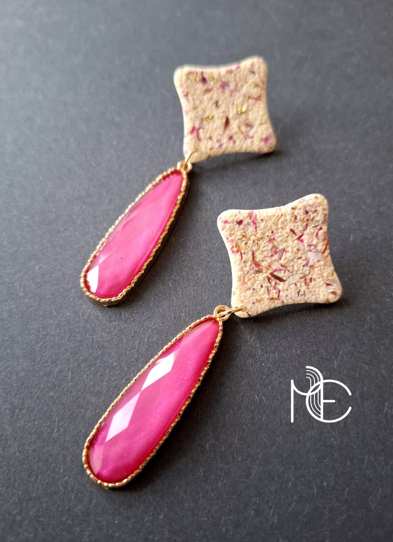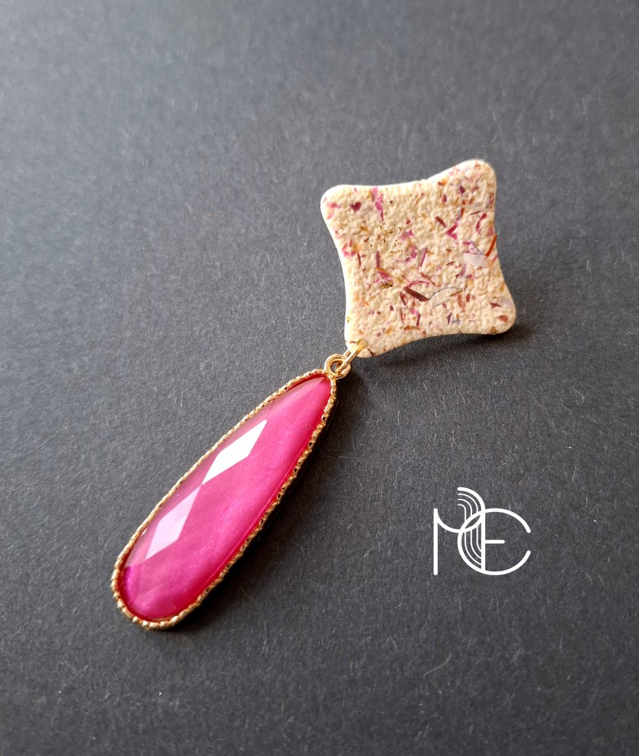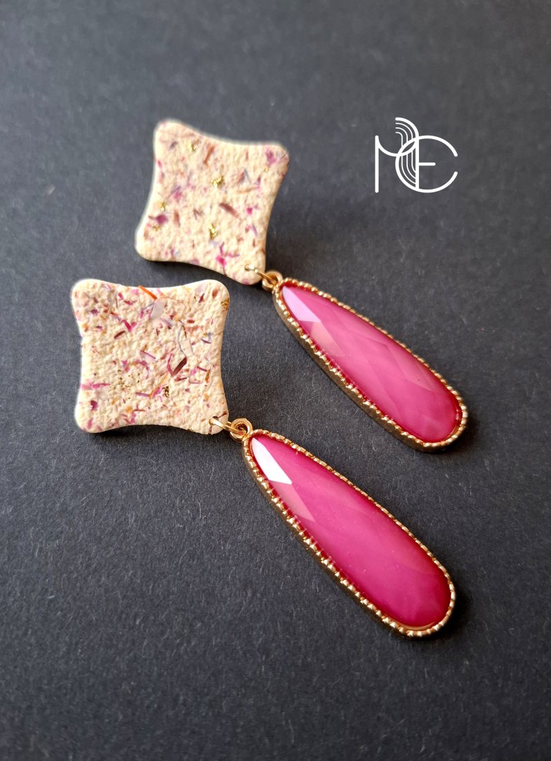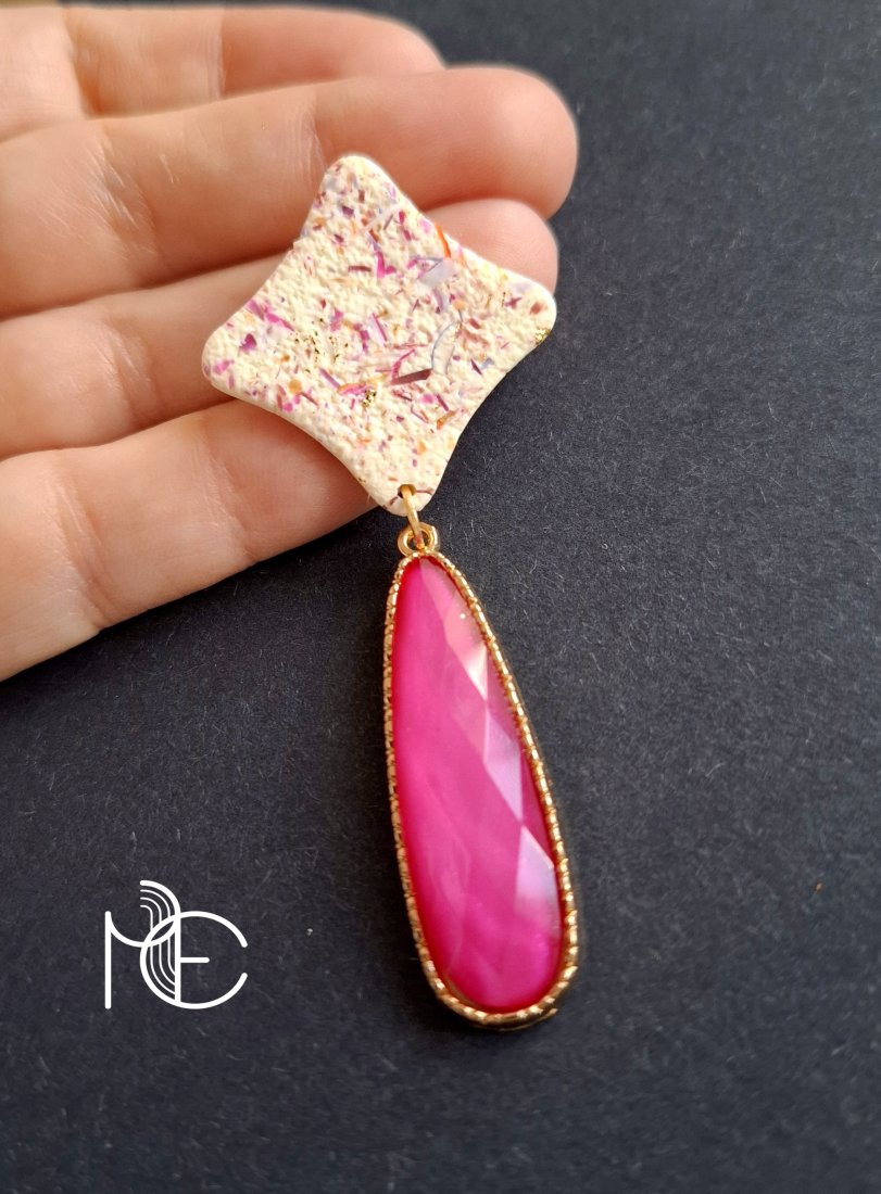 Lekkie kolczyki na sztyfty wykonane z wysokiej jakości glinki polimerowej z dodatkiem ozdobnych elementów akrylowych. Jednostronne z pozłacanymi, nieuczulającymi sztyftami z klasycznymi barankami. Wymiary: długość całkowita: 7,3 cm; szerokość max. 3 cm. Wykonane w jedynym egzemplarzu.