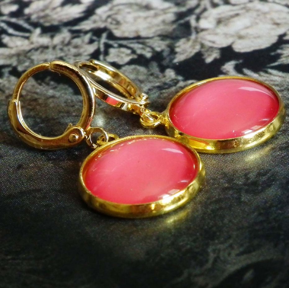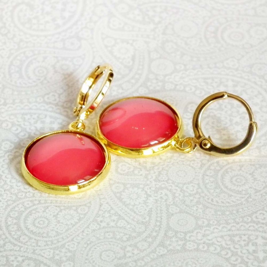 Subtelne, eleganckie kolczyki wiszące ze szklanym oczkiem w delikatnym odcieniu koralowym, w oprawie w kolorze złotym. Wygodne bigle okrągłe, zapinane (tzw. bigle-kajdanki), pokryte 16K złotem. Bigle są hipoalergiczne.