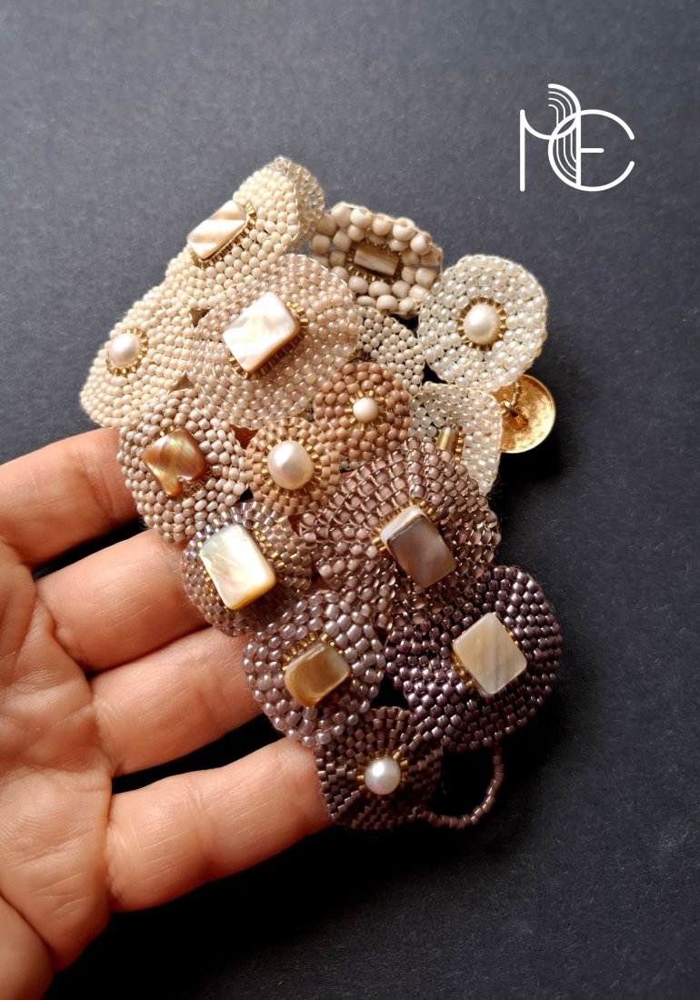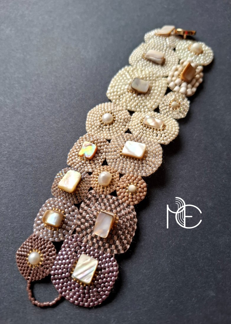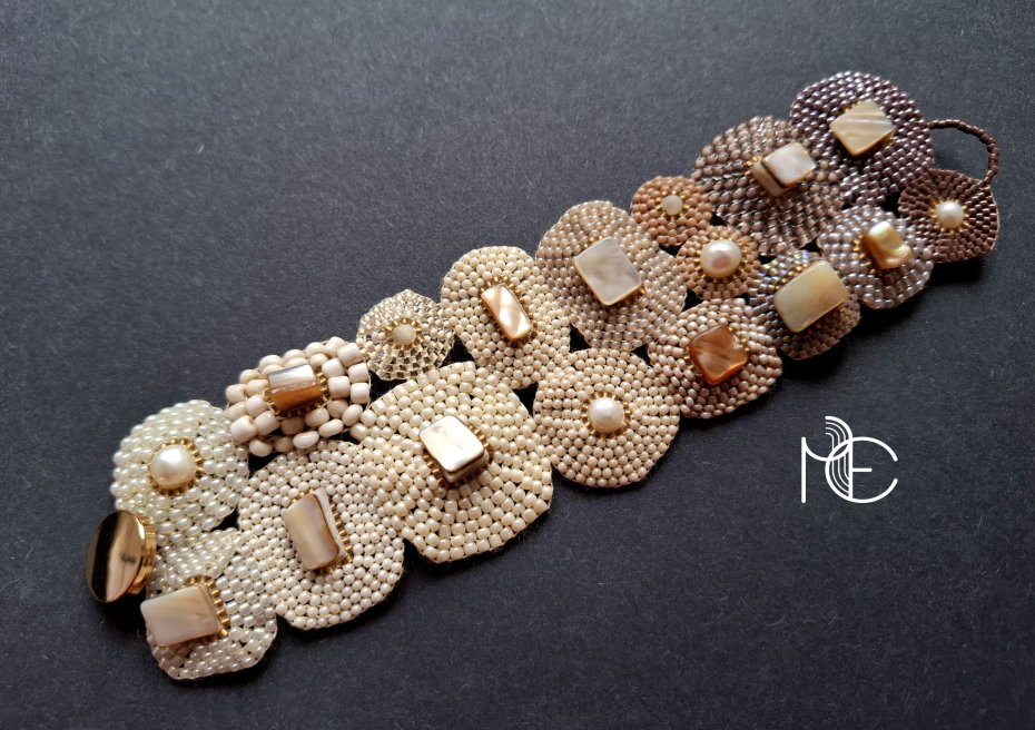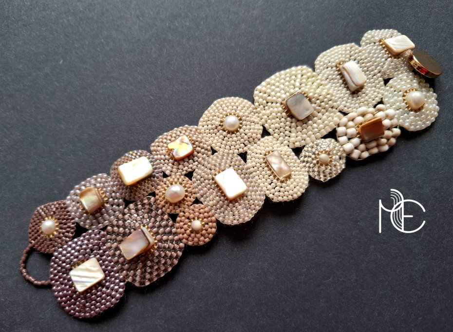 Ażurowa bransoleta wykonana techniką swoistego haftu drobnymi, szklanymi koralikami w połączeniu z naturalnymi perłami oraz muszlą. Dwustronna, zapinana na ozdobny, metalowy guzik. Wykonana w jedynym egzemplarzu. Wymiary: długość wraz z zapięciem: 18 cm, szerokość ok. 5,2 cm.