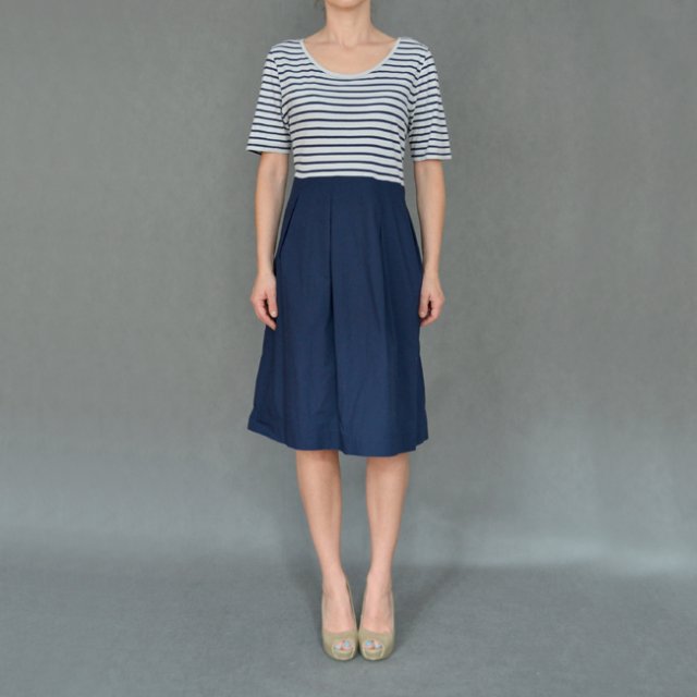 Sukienka marki COS. Góra elastyczna, t-shirtowa, w granatowo szare paseczki. Dół z koszulowej bawełny z kontrafałdami i kieszonkami. Polecam.