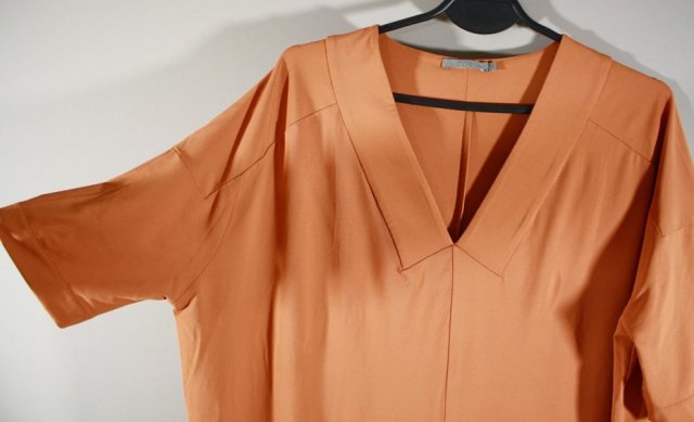 Rewelacyjna sukienka od COS , minimalistyczny fason , sukienka zwęża się dołem , co daje ciekawy kształt na sylwetce , fantazyjne wstawki przy dekolcie i na ramionach , tkanina lejąca , cięższa , mięsista , kolor to bardzo delikatny pastelowy łosoś .
