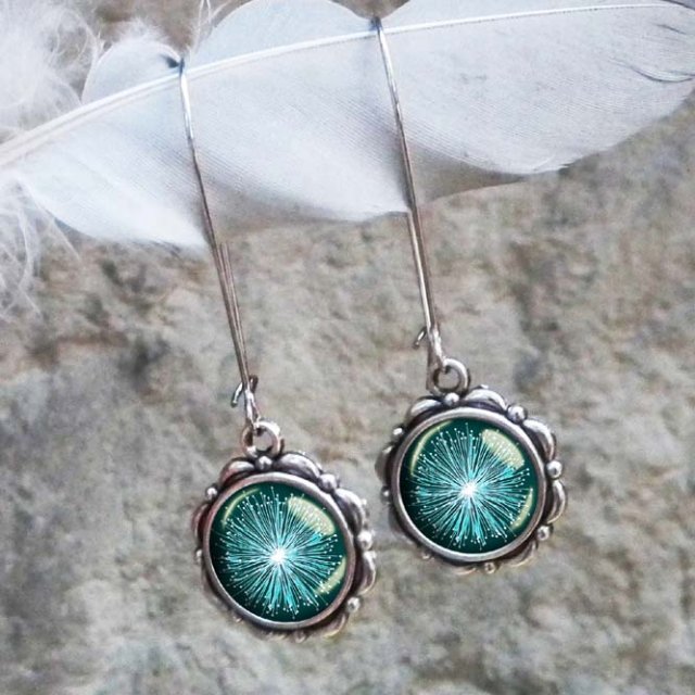 Kolczyki wiszące z oryginalną grafiką, zatopioną pod wypukłym szkiełkiem i oprawioną w bazę w kolorze antycznego,oksydowanego srebra. Grafika jest najwyższej jakości, wyraźna i nasycona. Bigle hipoalergiczne, zapinane posrebrzane. Oryginalne kaboszony- wykonane ręcznie według mojego projektu i przeze mnie, z dbałością o każdy detal. Biżuteria nie zawiera niklu i ołowiu.