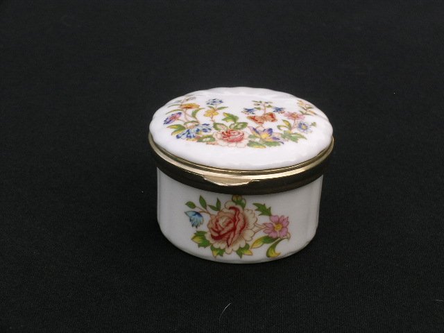 Eleganckie porcelanowe puzderko z serii Cottage Garden sygnowane jakością AYNSLEY Made in England Fine English Bone China. Charakterystyczne dla florystycznej linii tej serii zdobienie okraszone równie charakterystycznym motylem :) Wieczko na zawiasikach i w metalowej złotej obejmie. Ryflowanie, błyszczące szkliwienie. Niezwykła klasa. Szer. 6,5; góra 5,5; wys. niecałe 4 cm. Stan zachowania bdb.