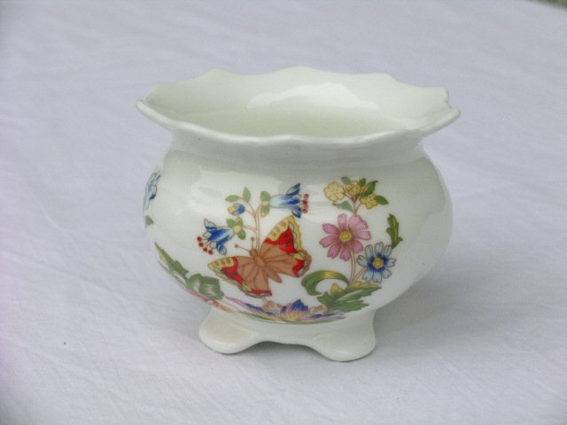 Porcelanowe naczynie w ciekawym kształcie, z kultowej, atrakcyjnej serii Cottage Garden. Jakość od Aynsley. Charakterystyczny barwny wzór ogrodowo-motylowy :) Lekkie ryflowanie, falbanowany rant i błyszczące wykończenie. Dół 5; góra 8; wys.6 cm. Stan zachowania bardzo dobry. Wartość kolekcjonerska.