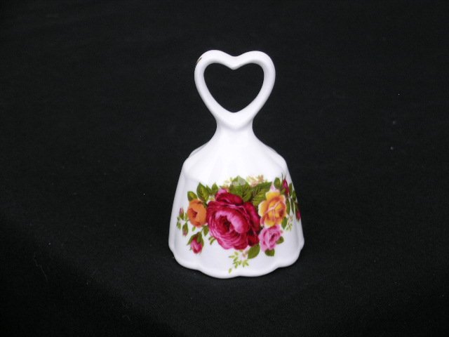 Czystą porcelaną dźwięczący, romantycznie kwiatowy i bardzo angielski niewielki dzwoneczek - bukietowa przyjemność na podorędziu w domu, dźwiękiem do stołu zapraszający :) Jakościowe wykonanie, falbanowe ryflowanie i złocenie sercowego uchwytu. Serce dzwonka wiązane, na oryginalnym łuczku zawieszone, nie przylepiane. 5,5 x 8 cm. Sygnowany. Stan zachowania bardzo dobry.
