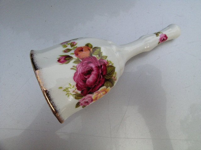 Czystą porcelaną dźwięczący, romantycznie kwiatowy i bardzo angielski całkiem spory dzwoneczek - bukietowa przyjemność na podorędziu w domu, dźwiękiem do stołu zapraszający :) Jakościowe wykonanie, falbanowe ryflowanie i złocenie sercowego uchwytu. Serce dzwonka wiązane, na oryginalnym łuczku zawieszone, nie przylepiane.