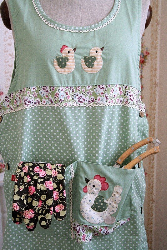 Uroczy zielony fartuszek w białe kropeczki. Z wiejskim motywem uroczej kurki i kurczaków. Z przodu dwie kieszonki, po bokach zapinany na guziczki.