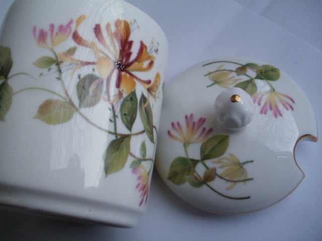 Porcelanowa cukiernica. Sygnowana " Country flowers royal GRAFTON Fine Bone China Made in England ". Szlachetna porcelana, pod światło żarówki prześwitująca, dźwięczna, solidna. Prosta forma, ozdobny uchwyt, dziurką na łyżeczkę. Przykrywka z rantem zabezpieczającym przed spadaniem. Radosny, kolorowy wzór kwiatowy. Złocenia. Wykończenie satynowo - błyszczące. Swietnie sprawdzi się również jako pojemnik na konfitury, majonez....