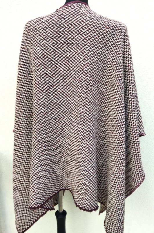 Zaprojektowane i wykonane ręcznie poncho z wełnianej przędzy w kolorze łamanej bieli i kasztanowego brązu/