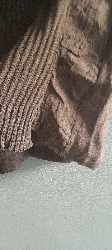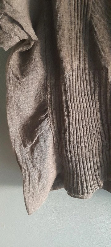 Lniana bluzka z dwóch rodzajów materii lnianej, stan bardzo dobry, odcień brązu w realu zimniejszy długość 58/48,szerokość pod pachami 55x2