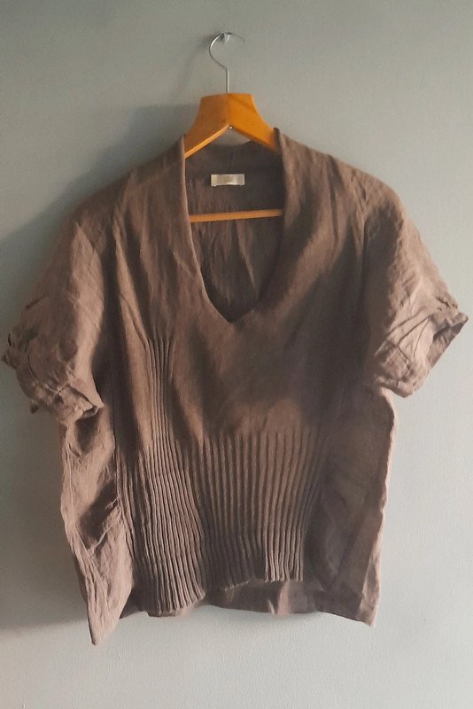 Lniana bluzka z dwóch rodzajów materii lnianej, stan bardzo dobry, odcień brązu w realu zimniejszy długość 58/48,szerokość pod pachami 55x2