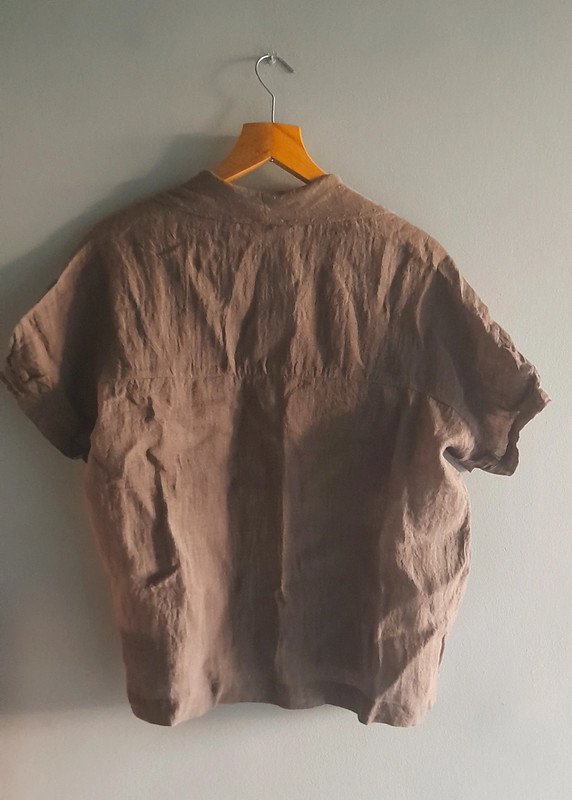 Lniana bluzka z dwóch rodzajów materii lnianej, stan bardzo dobry, odcień brązu w realu zimniejszy długość 58/48,szerokość pod pachami 55x2