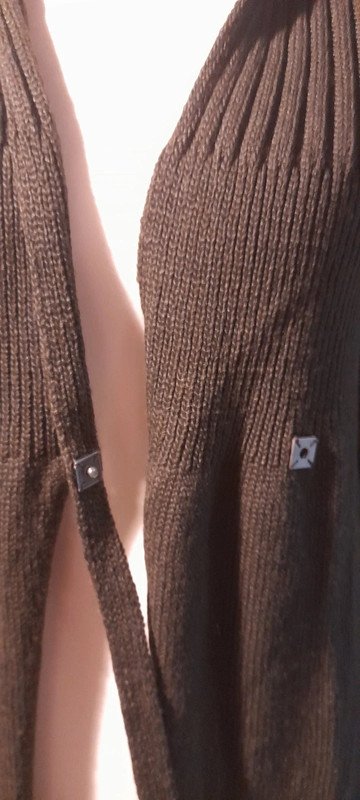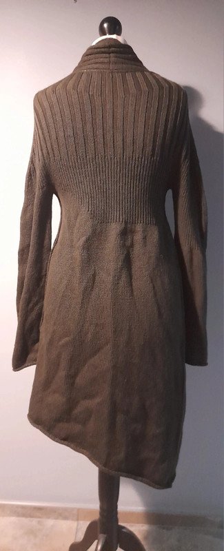 stylowy, świetny gatunkowo, nowy bez papierowej metki, asymetryczny sweter, kardigan, świetny fason, mięsista,lekko szorstka dzianina, piękny, lekko przydymiony brąz,zapinany na kwadratową,metalową napę, wyrafinowany fason z detalami nadającymi wyjątkowość formie, długość 85/105, szerokość pod pachami i w pasie,przy zapiętej napie 42 bez naciągania, niszowa ekskluzywna casualowa francuska marka, 260 euro,w realu plus 100%, zimny brąz, całoroczny