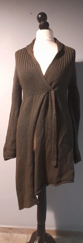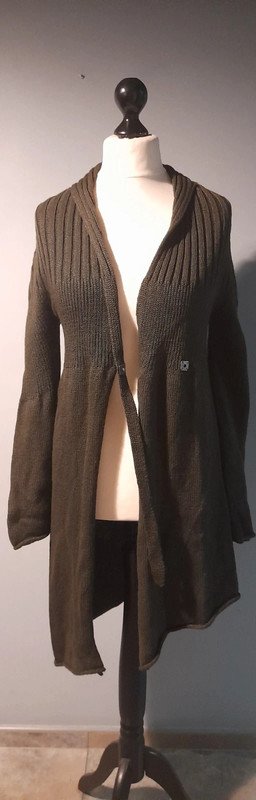 stylowy, świetny gatunkowo, nowy bez papierowej metki, asymetryczny sweter, kardigan, świetny fason, mięsista,lekko szorstka dzianina, piękny, lekko przydymiony brąz,zapinany na kwadratową,metalową napę, wyrafinowany fason z detalami nadającymi wyjątkowość formie, długość 85/105, szerokość pod pachami i w pasie,przy zapiętej napie 42 bez naciągania, niszowa ekskluzywna casualowa francuska marka, 260 euro,w realu plus 100%, zimny brąz, całoroczny