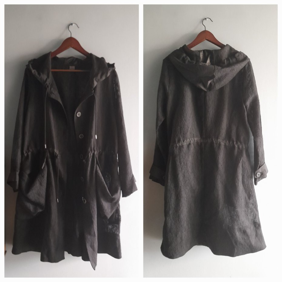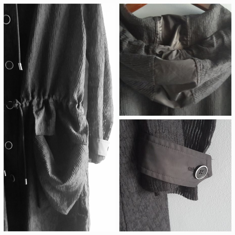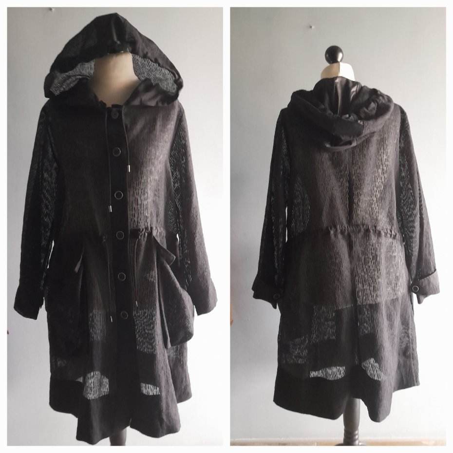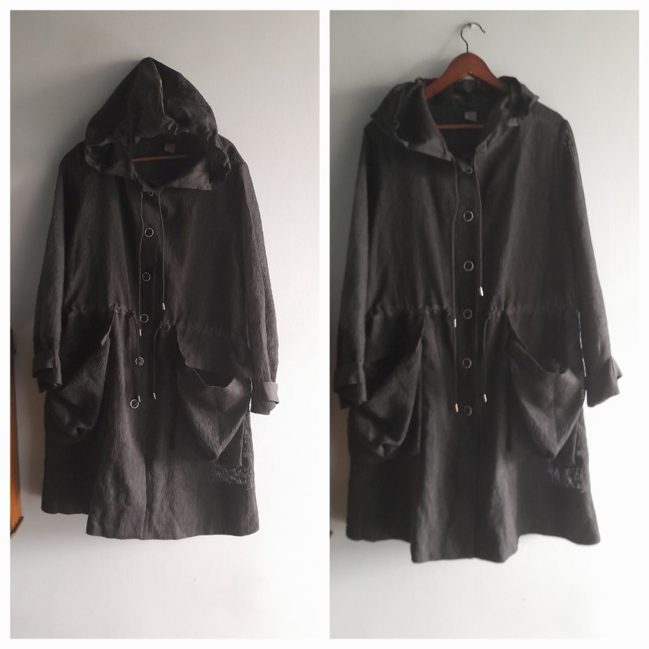 Nowy bez papierowej metki płaszcz/kurtka darkstyle, awangardowy, częściowo lekko przezroczysty, w pasie I przy kapturze trokiem, świetny fakturowy materiał i wykonanie, unikatowy, uniwersalny, rozmiar z metki 36, manekin rozmiar 38/40, długość 100, szerokość pod pachami 52x2
