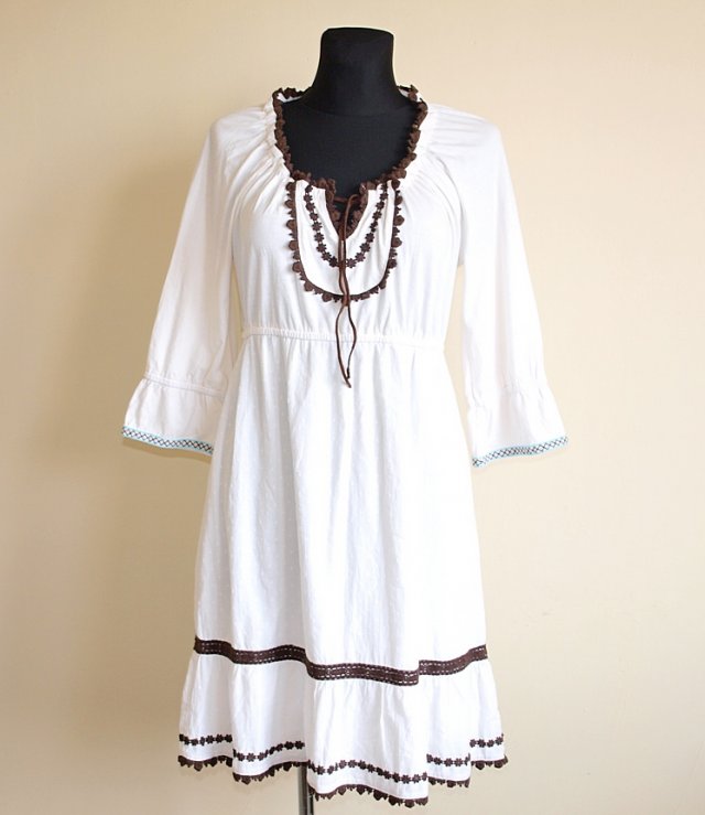 Letnia sukienka duńskiej marki Cream. Materiał 100% bawełna. Stan nowa z metką . Góra z dzianiny podkoszulkowej, dół z delikatnego materiału bawełnianego, pod spodem bawełniana podszewka. Ozdobiona bawełnianą koronką w kolorze ciemnego brązu. Rękaw 7/8 raglanowy. Kolor to jakiś odcień bieli, nie jest to śnieżna biel. Rozmiar 40, ale to chyba bardziej 38. Podaję wymiary mierzone na płasko;