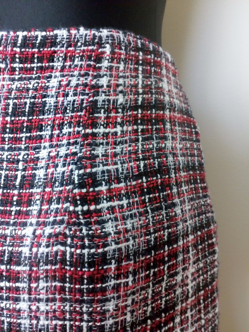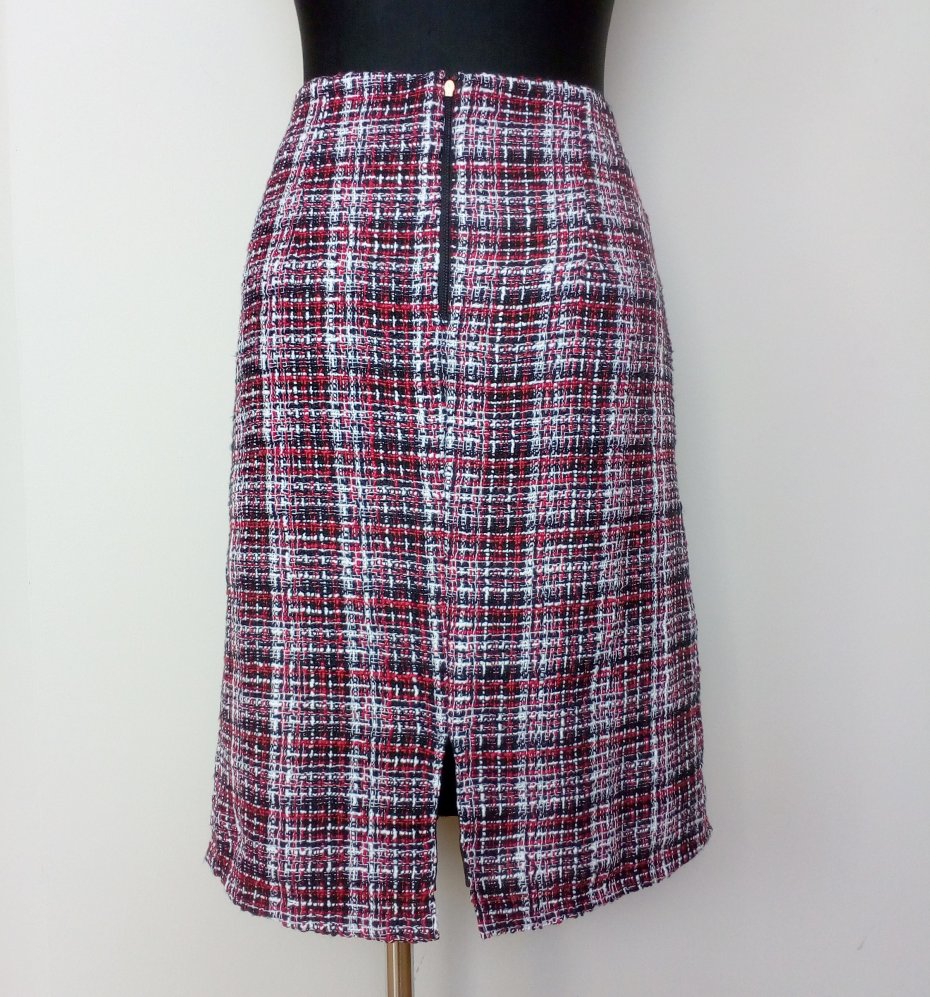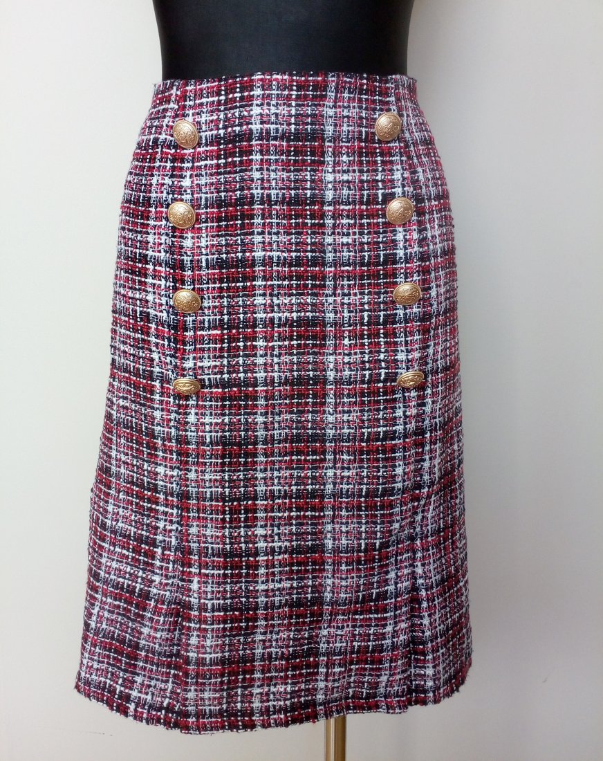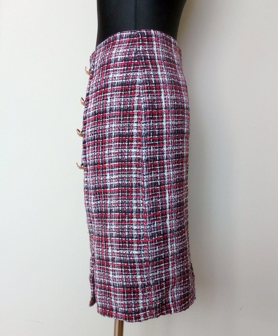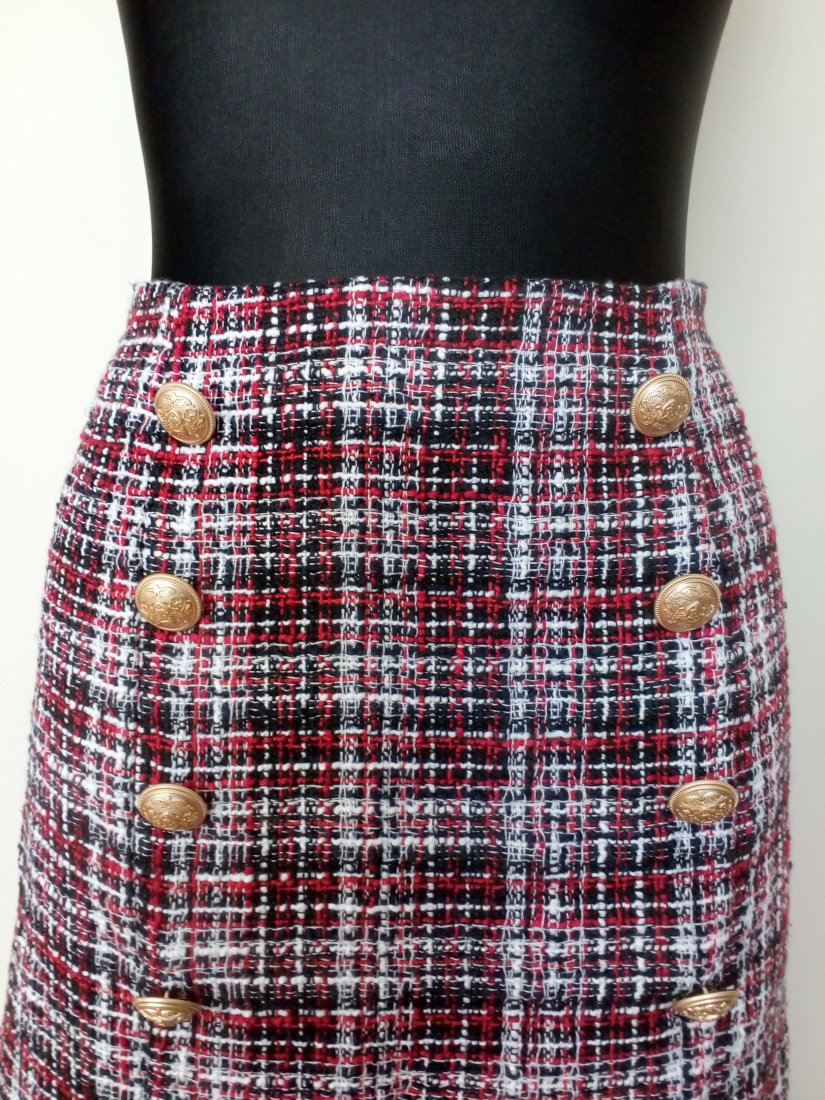 Spódnica z ozdobnymi guzikami, zapinana w tyle na zamek i guzik, u dołu tyłu rozcięcie, z przodu od szwów pionowych na których są guziki również niewysokie rozcięcia, od środka czarna podszewka