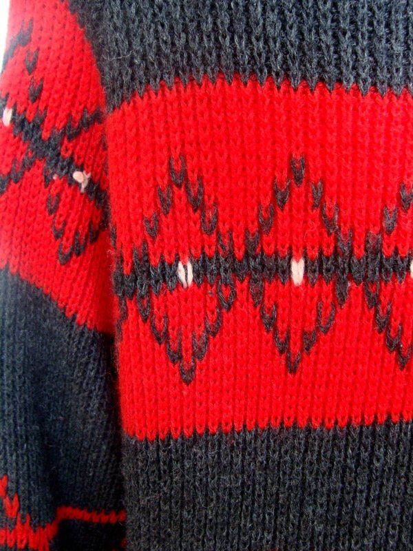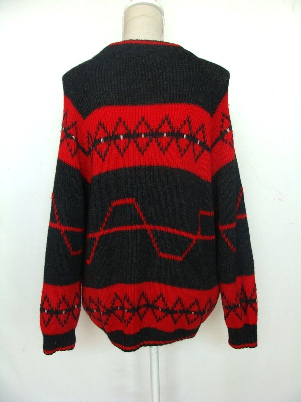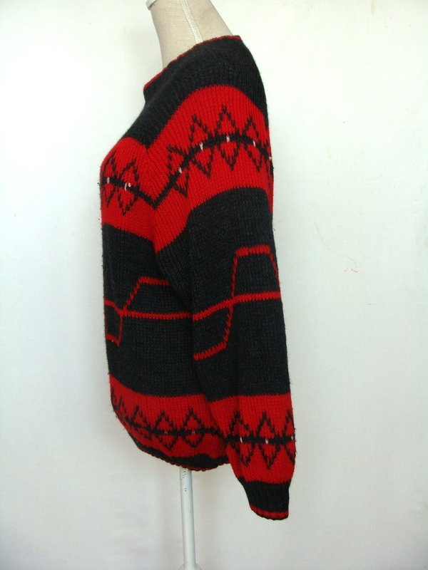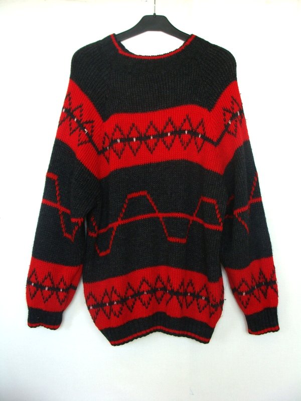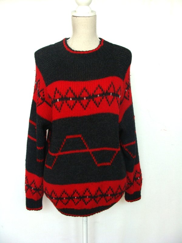 Wzorzysty sweter w grafitowo- czerwonym kolorze z raglanowymi rękawami .Wykonany mięsistym angielskim ściegiem. Wykończony ściągaczami.