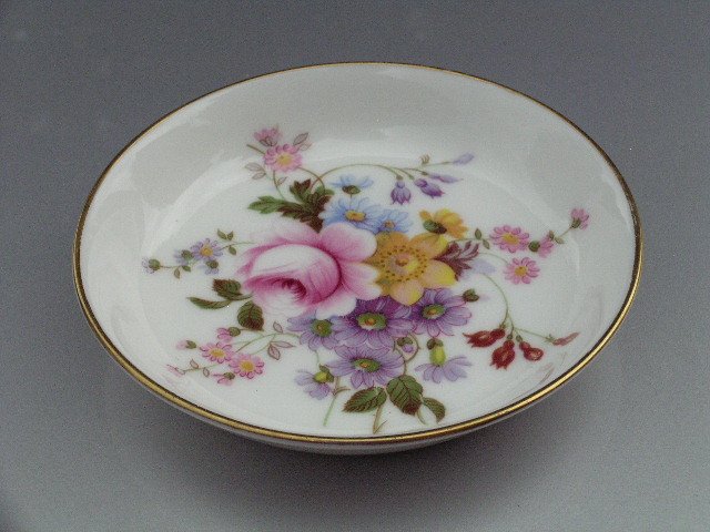 Porcelanowy niewielki Talerzyk - Podstawek sygnowany ROYAL CROWN DERBY Made in England Bone China DERBY POSIES LYI Bardzo szlachetna porcelana w kolorze ciepłej bieli. .; Rant górny złocony. Wykończenie błyszczące. Delikatny wzór kwiatowy w ciepłych, harmonijnych barwach wygląda / może jest / jak ręcznie malowany; Wręcz widać pociągnięcia pędzla. Bardzo elegancki,kobiecy,szlachetny.