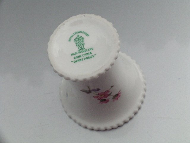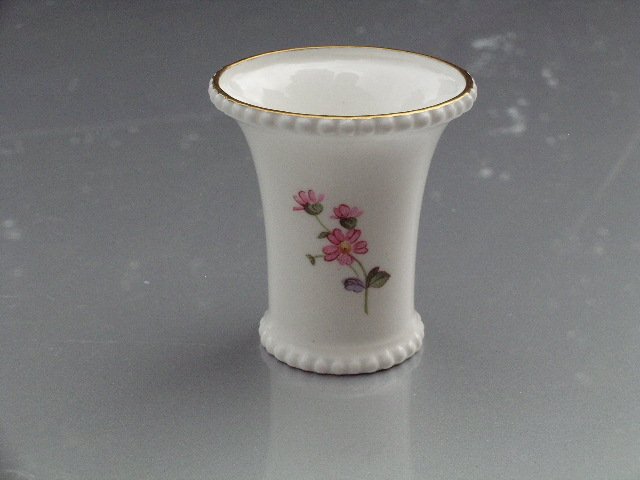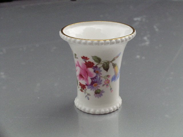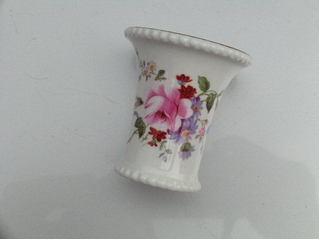 Porcelanowy niewielki Wazonik sygnowany ROYAL CROWN DERBY Made in England Bone China DERBY POSIES Bardzo szlachetna porcelana w kolorze ciepłej bili. Ranty wypukłe bardzo ciekawie wykonane; Rant górny złocony. Wykończenie błyszczące. Delikatny wzór kwiatowy w ciepłych, harmonijnych barwach wygląda / może jest / jak ręcznie malowany; Wręcz widać pociągnięcia pędzla. Bardzo elegancki,kobiecy,szlachetny.