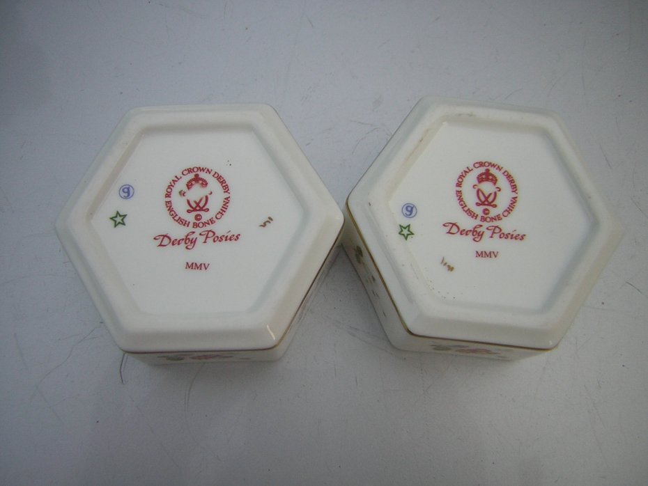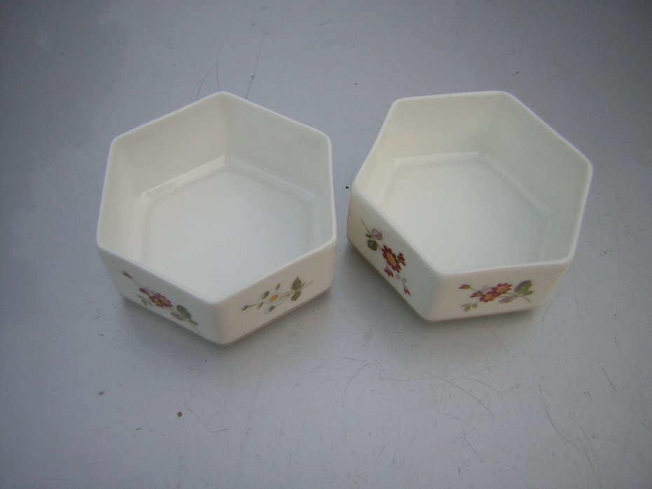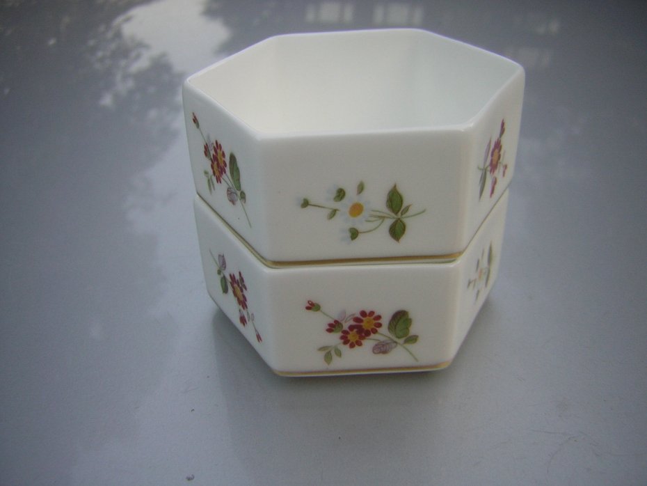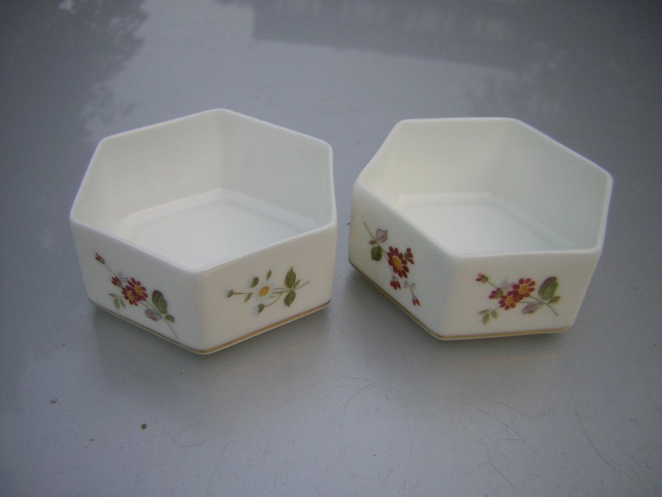 Szlacetnie Porcelanowe, pojemniczki dwa. Sygnowane ROYAL CROWN DERBY Made in England Bone China DERBY POSIES MMV , oraz dodatkowe oznaczenia plus ręcznie chyba numerycznie oznaczone. Bardzo szlachetna, dźwięczna porcelana w kolorze ciepłej bieli.,ciekawy sześciokątny kształt. Delikatny wzór kwiatowy w ciepłych, harmonijnych barwach Wy kończenie błyszczące. . Bardzo elegancki,kobiecy,szlachetny.