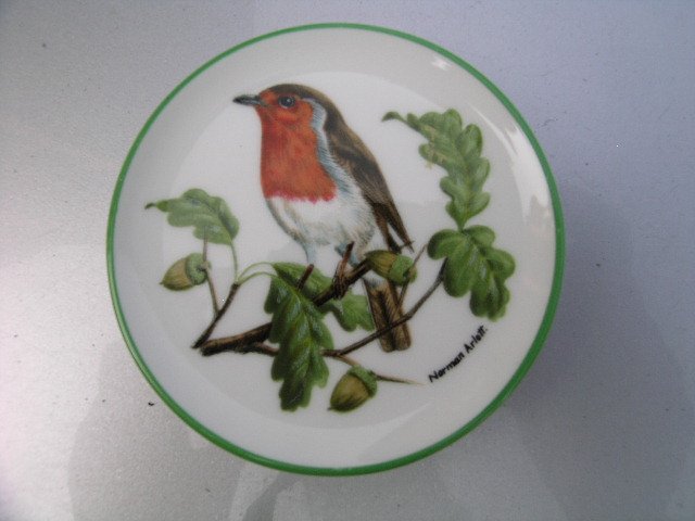 Niewielki Porcelanowy Talerzyk-Spodeczek. Wielkością na torebkę od herbaty,plasterek cytryny...Użytkowy i dekoracyjny. Sygnowany CROWN STAFFS ENGLAND.Na awersie podpis autora malunku NORMAN ARLETT. Biała szlachetna porcelana na błyszcząco szkliwiona. Naturalne, żywe,miłe dla oka barwy. Rant zielony. Nie wiem jaki to ptaszek - ale jest absolutnie uroczy :)