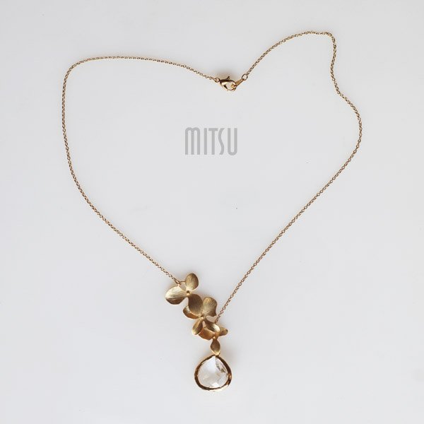 Delikatny, asymetryczny, wyrazisty naszyjnik, zbudowany z listków , drobniutkiego łańcuszka oraz kryształu. Naszyjnik jest wykonany z brązu platerowanego 16 karatowym złotem. . Mierzy 42,5 cm plus 3 cm wisiorek - jeden listek i kryształ. Krystał mierzy 15 x 18 mm. i jest przejrzysty. Naszyjnik podróżuje ładnie zapakowany.