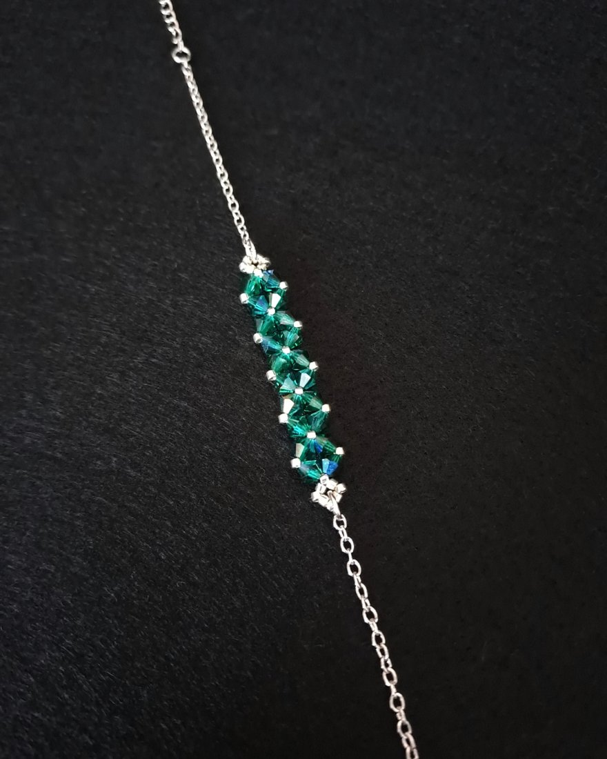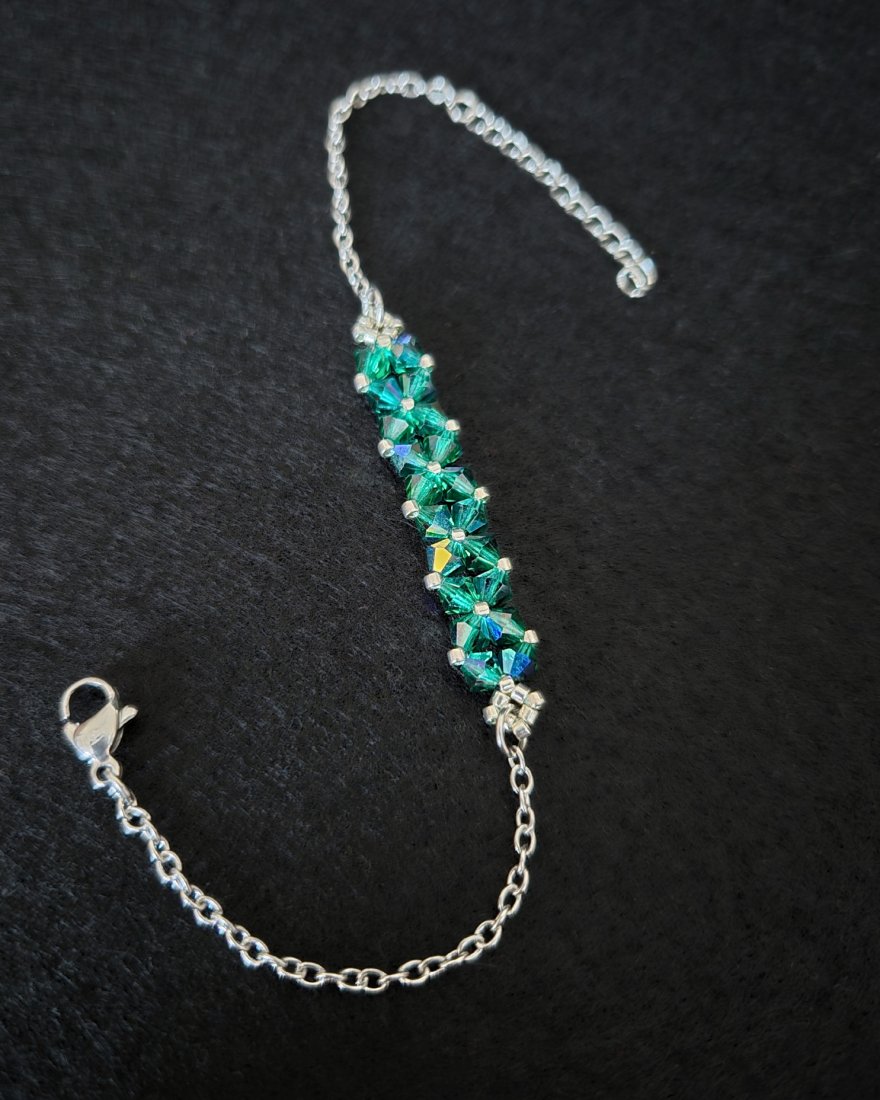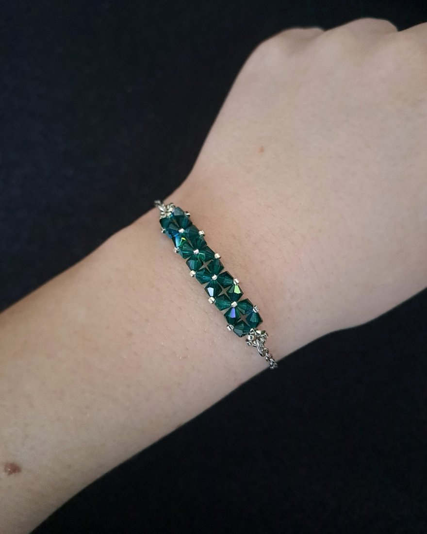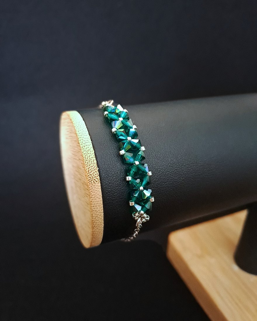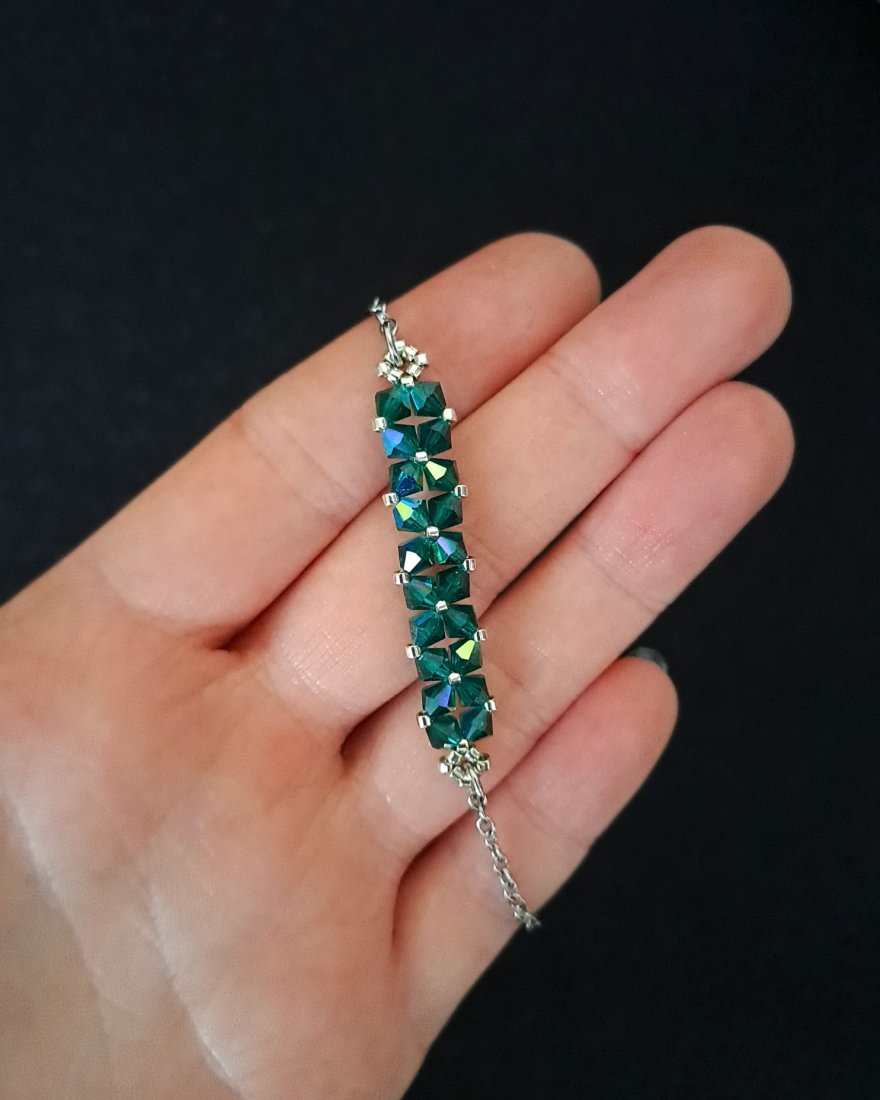 Bransoletka powstaje z kryształków Preciosa w kolorze Emerald AB, które dzięki opalizującemu wykończeniu pięknie odbijają światło, ukazując głębię zieleni z delikatnym, tęczowym połyskiem. Towarzyszą im drobne koraliki Miyuki Delica w srebrnym odcieniu, znane z wyjątkowej regularności i precyzji wykonania.