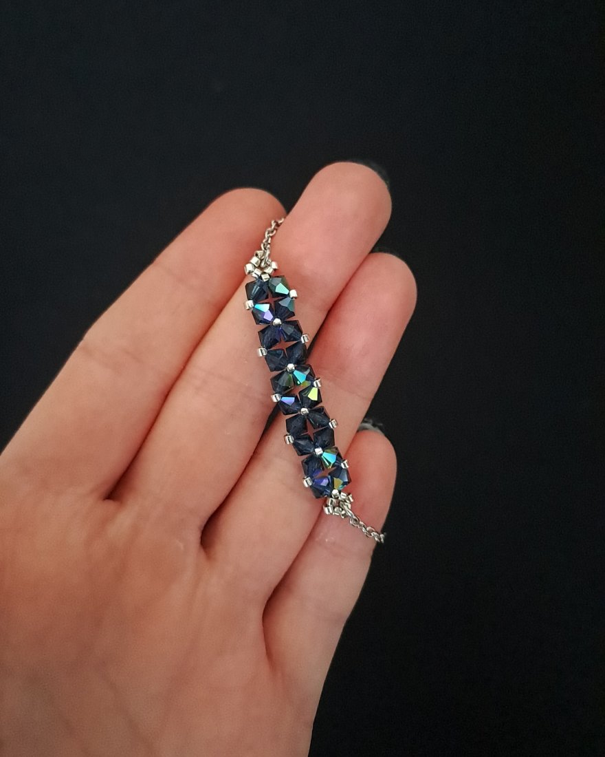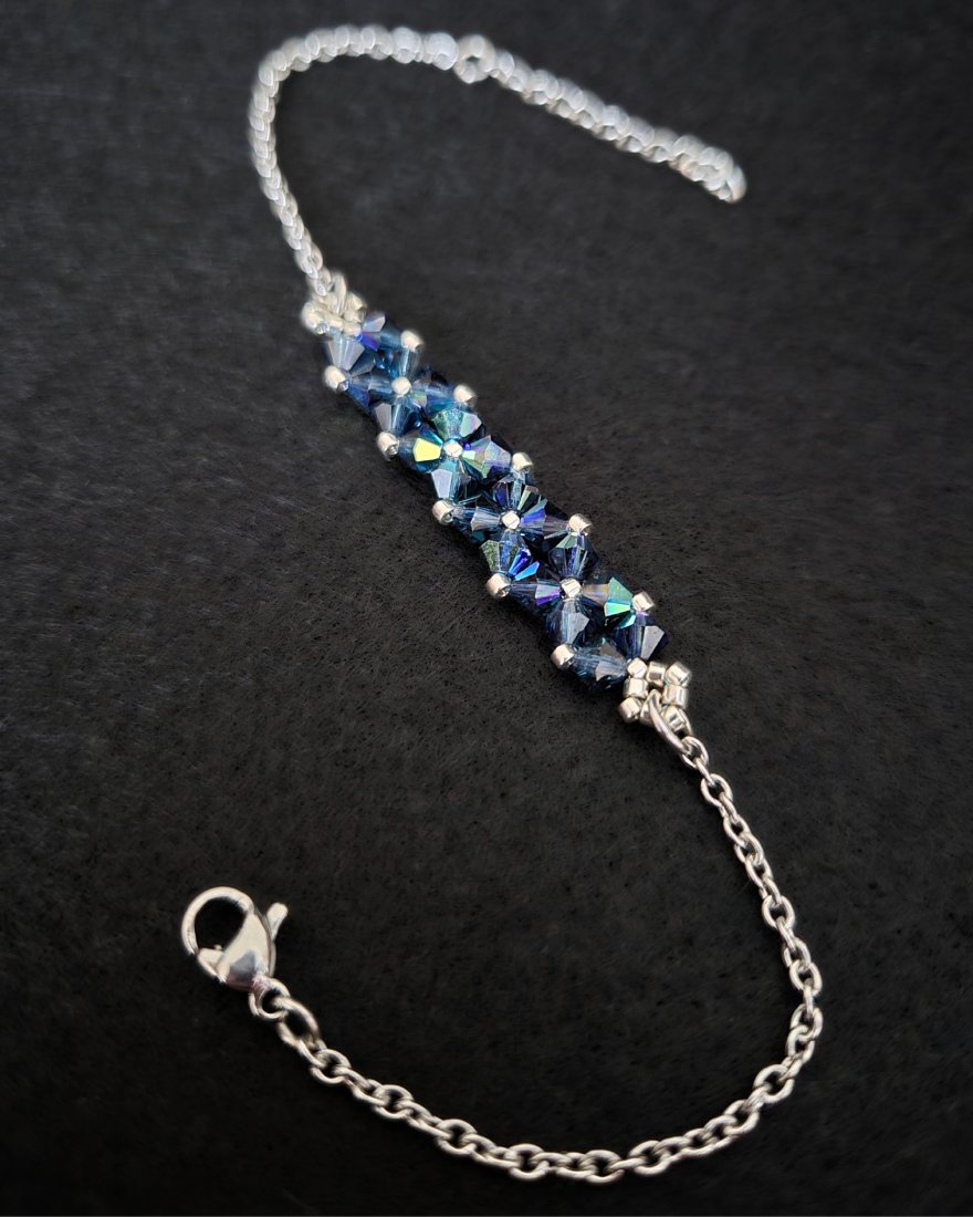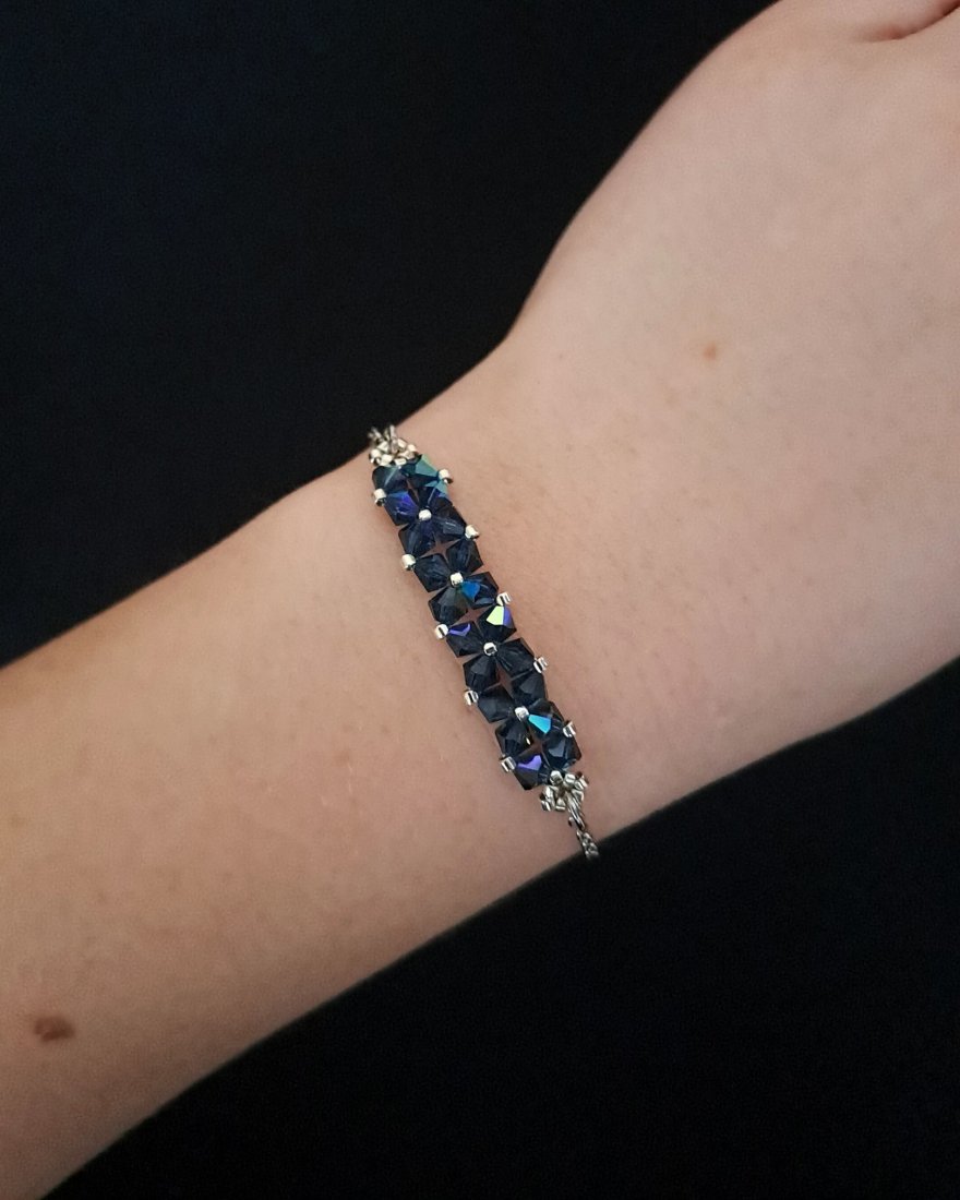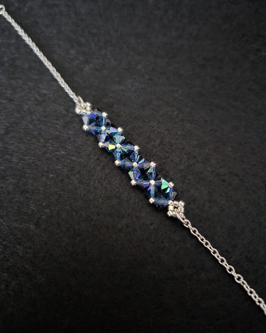 Bransoletka stworzona z kryształków Preciosa w kolorze Montana AB, które dzięki opalizującemu wykończeniu zachwycają wielobarwną grą światła, nadającą biżuterii dynamiczny, szlachetny charakter. Towarzyszą im drobne koraliki Miyuki Delica w srebrnym odcieniu, znane z wyjątkowej regularności i precyzji wykonania.