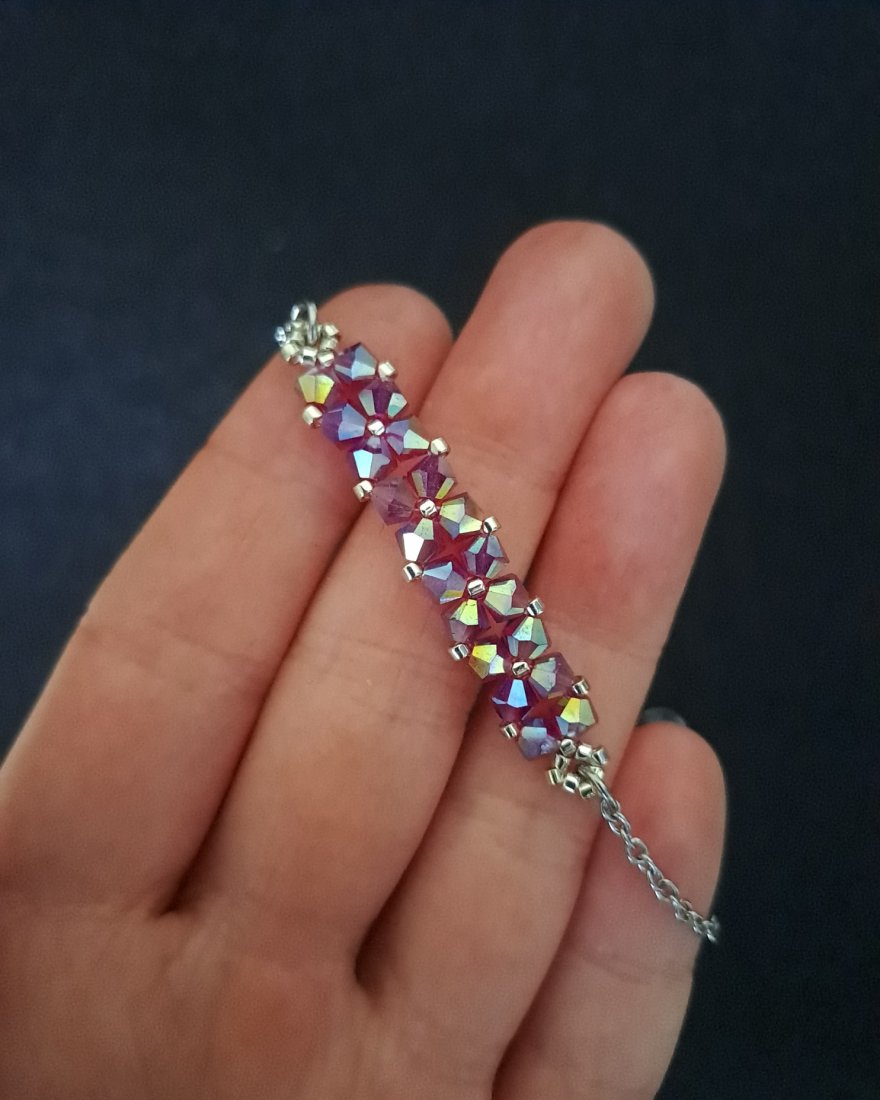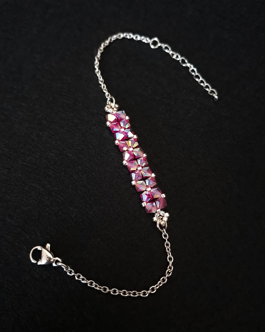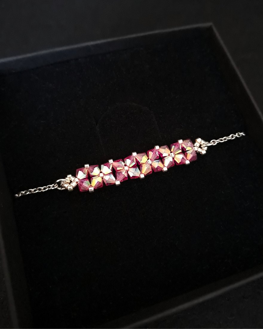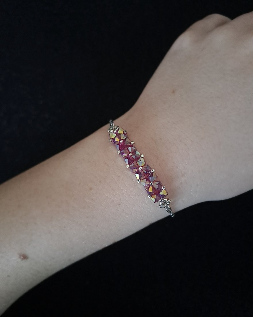 Bransoletka powstaje z kryształków Preciosa w kolorze Fuchsia AB, które dzięki opalizującemu wykończeniu pięknie odbijają światło, ukazując intensywny odcień różu z wielobarwnym, tęczowym połyskiem. Towarzyszą im drobne koraliki Miyuki Delica w srebrnym odcieniu, znane z wyjątkowej regularności i precyzji wykonania.