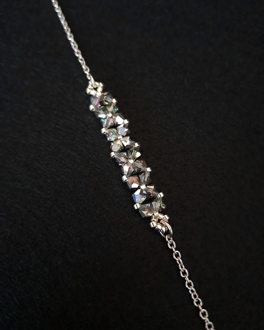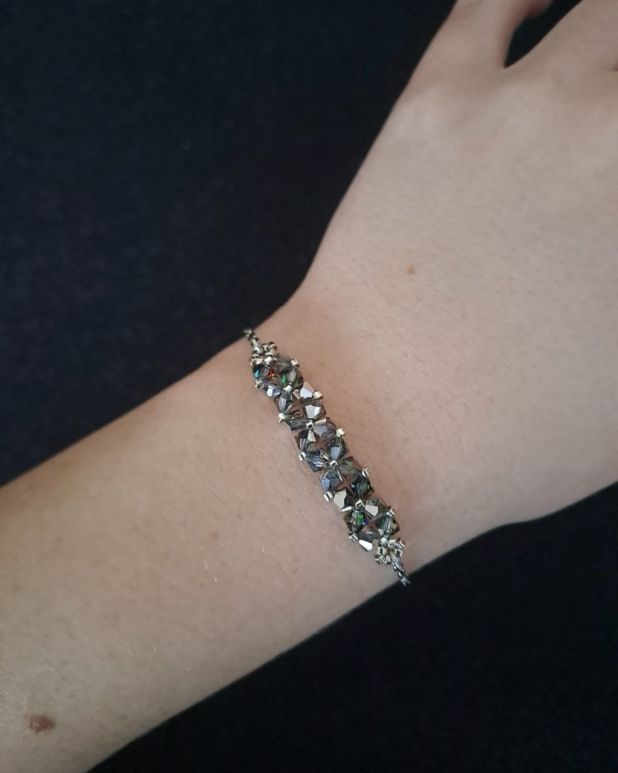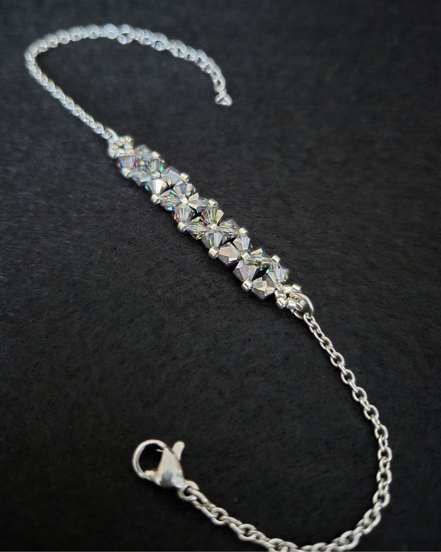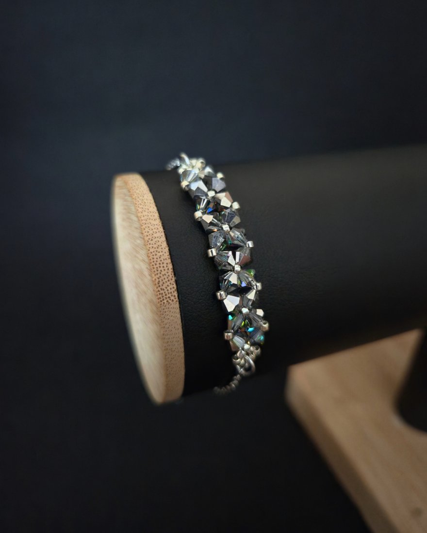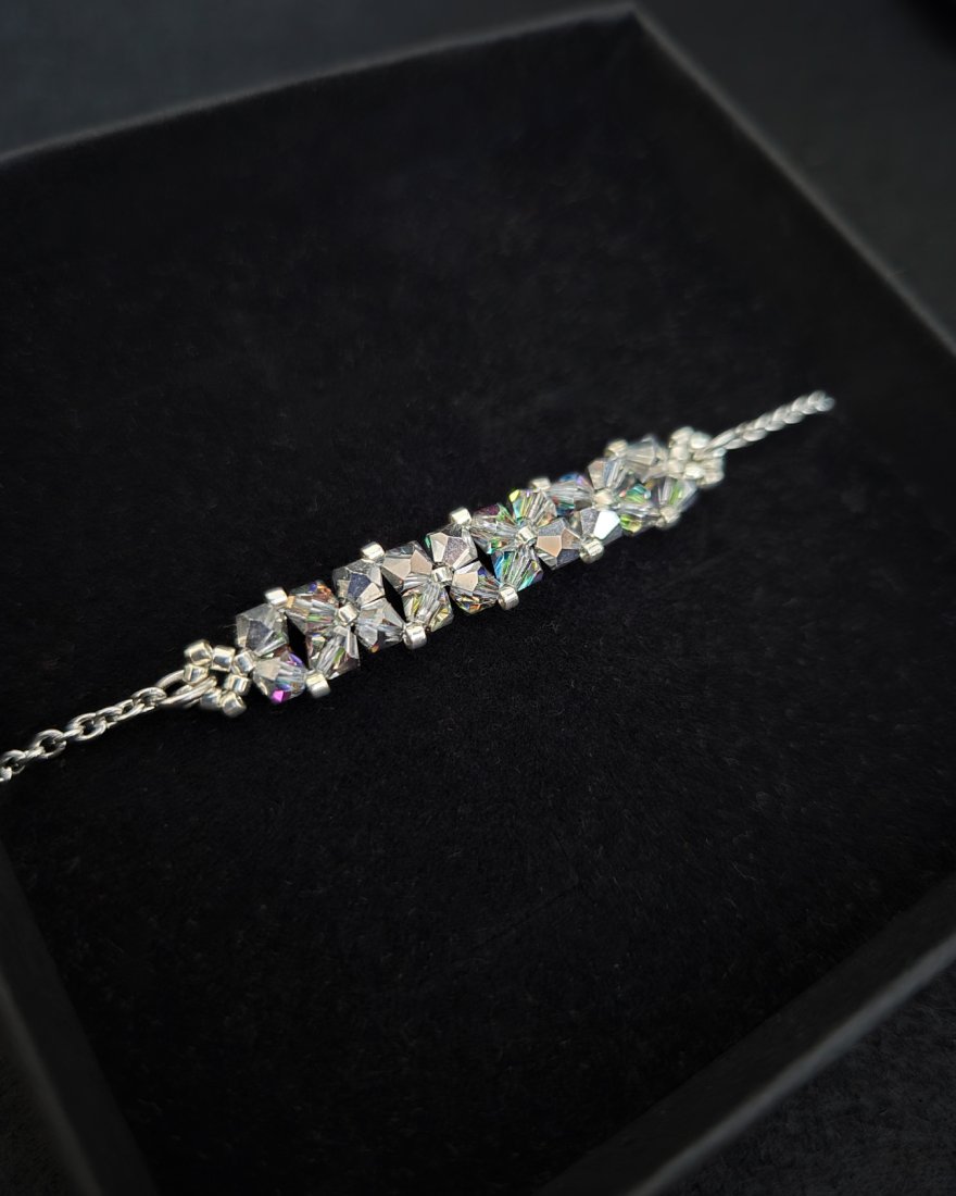 Bransoletka powstaje z kryształków Preciosa w kolorze Vitrail Medium, które dzięki opalizującemu wykończeniu zachwycają wielobarwną grą światła. W zależności od kąta padania światła pojawiają się subtelne refleksy zieleni, błękitu, złota i ciepłych tonów pomarańczy, nadając biżuterii dynamiczny, szlachetny charakter. Towarzyszą im drobne koraliki Miyuki Delica w srebrnym odcieniu, znane z wyjątkowej regularności i precyzji wykonania.