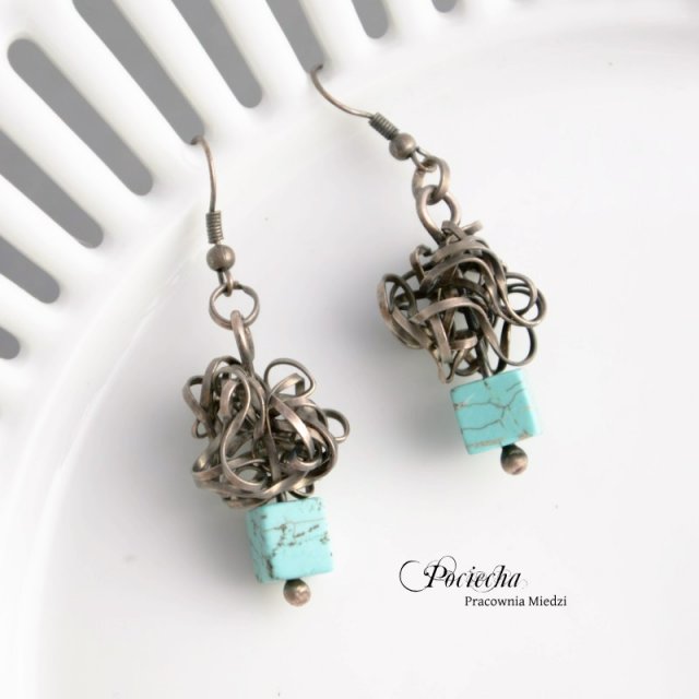 Oryginalne kolczyki stworzone ręcznie z miedzi. Ręcznie kute elementy połączyłam z kostkami turkusu o wymiarze 8 mm. Kolczyki mają długość całkowitą ok. 5,5 cm. Bigle w kolorze antycznej miedzi, antyalergiczne.