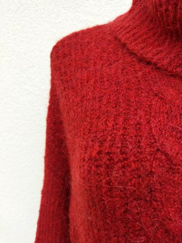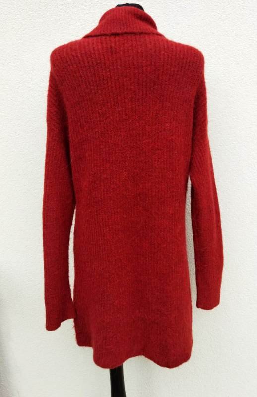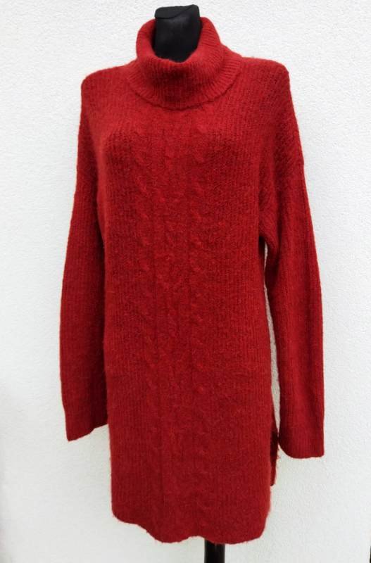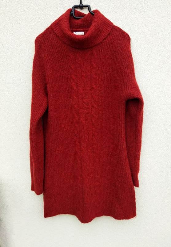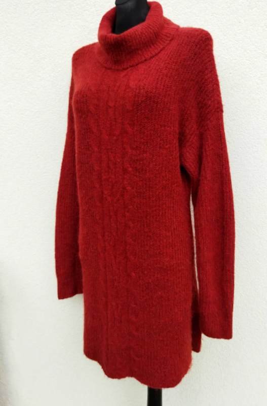 Ciepła dzianinowa sukienka z dobrej jakości mieszanki składników w melanżowej kolorystyce zgaszonej czerwieni z kropla brązu, z wplatanym warkoczem z przodu. Z luźnym golfem , z rozcięciami po bokach. Miła, miękka, rozciągliwa , wygodna i ciepła.