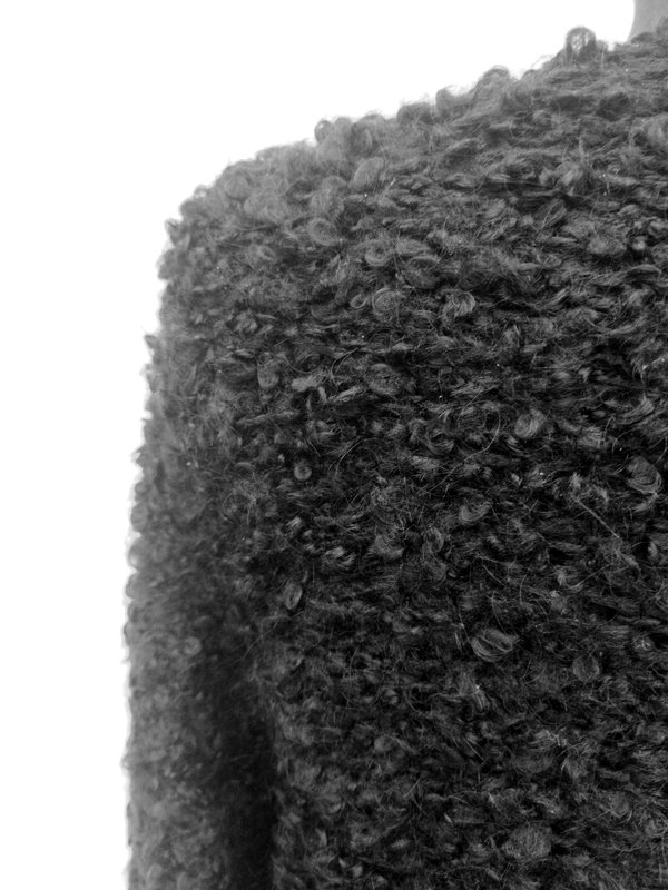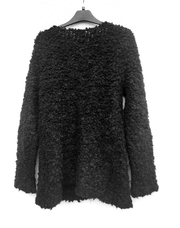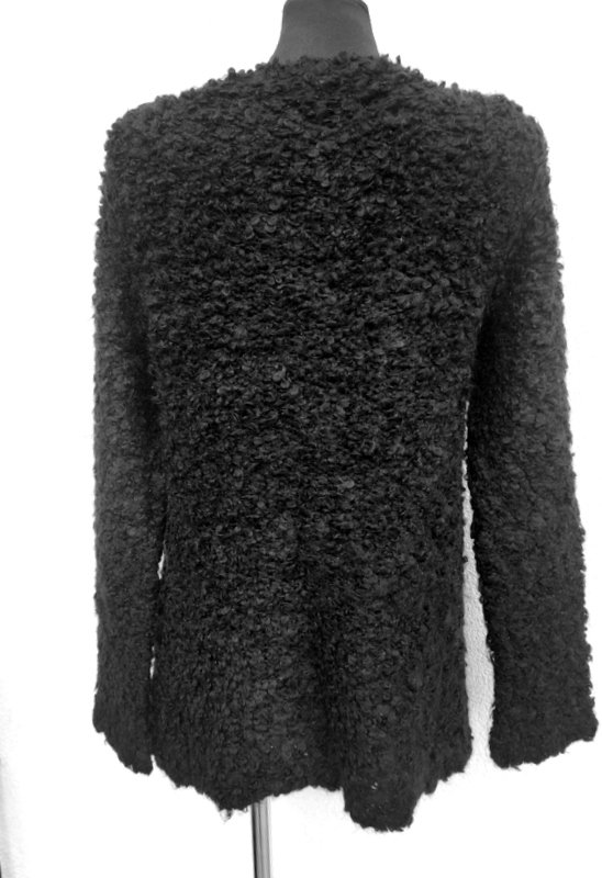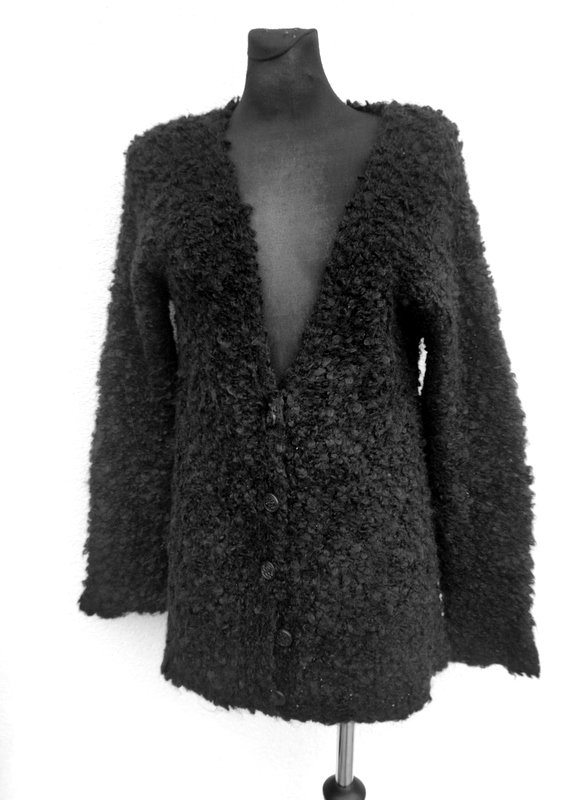 Puszysty rozpinany sweter z dobrej jakości akrylowo-wełnianej włóczki w czarnym kolorze z fakturą boucle. Dekolt w szpic. zapinany na ozdobne guziki w czarnym kolorze.