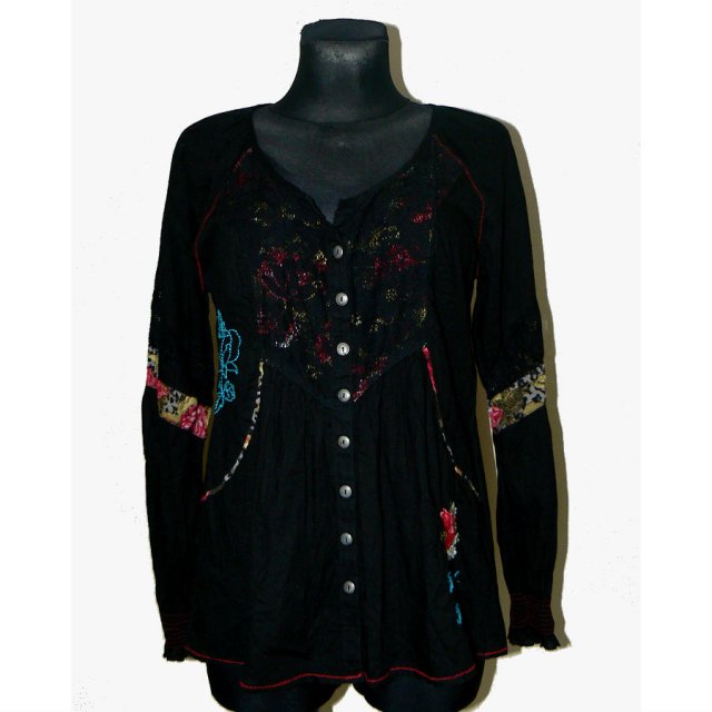 Przeurocza lekka bluzeczka, intensywnie czarna z mnóstwem pięknych zdobień. Są hafty i koronkowe wstawki podszyte materiałem w róże. Rękawy zakończone szerokim rzędem drobnych gumeczek, zapinana na metalowe matowe guziki.