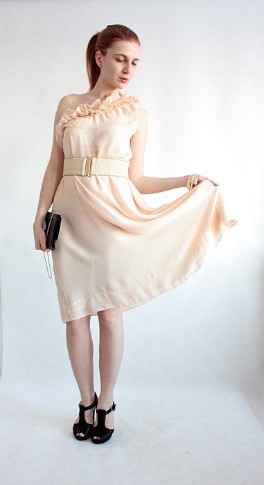 Wytworna suknia ze zwiewnej tkaniny (prawdopodobnie żorżeta), na podszewce.