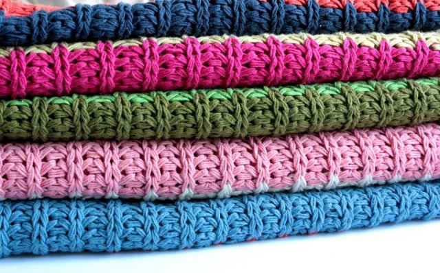 Piękna, miękka, niezwykle kolorowa narzuta o grubych splotach wykonana prawdopodobnie na drutach z bawełnianej włóczki. Można położyć ją na fotelu, szezlongu, sofie lub łóżku (na większą powierzchnię polecam położenie dwóch narzut).