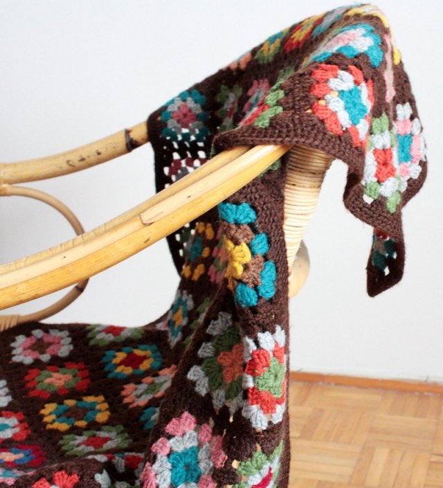 Piękna, miękka, niezwykle oryginalna narzuta o grubych splotach wykonana prawdopodobnie na szydełku z akrylowej włóczki. Będzie pasować na nieduży fotel, krzesło. Efektownie wygląda również jako bieżnik na stół. Może również pełnić rolę ozdobnego kocyka, którym można przykryć się czytając książkę.