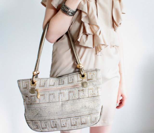 Pojemna, oryginalna torba w złotawo-beżowe wzory. Zapinana na suwak. Wewnątrz duża przegroda na suwak. Dodatkowo mała kieszonka również na suwak.Torba jest wykonana z grubej tkaniny.