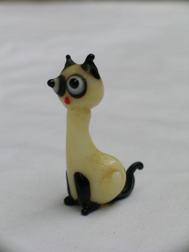 Przezabawna, ręcznie wykonana szklana figurka. Kot jak się patrzy - prawdziwy cudak :) No i ten ogonek ! Prawdziwa ozdoba kolekcji. 3 x 2 x 5 cm. Stan zachowania bardzo dobry.