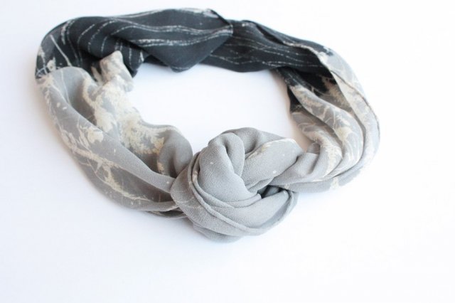 Zwiewny szal w przelewanych odcieniach szarości, z subtelnym wzorem. Materiał oceniam na jedwab (ręczne rolowanie).