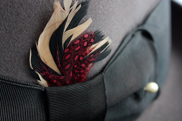 Przepiękny kapelusz ozdobiony piórkiem i cudną szpilką. Można zdjąć ozdoby i nosić w prostej wersji (jak na ostatnim zdjęciu).