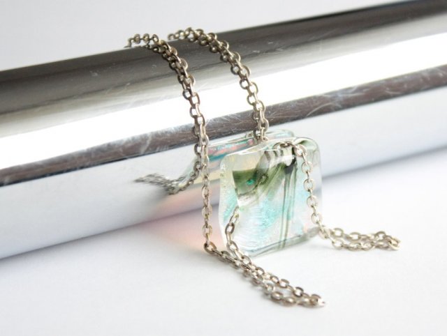Wyjątkowy, szklany wisiorek na łańcuszku w kolorze srebrnym. Wisiorek pięknie się mieni i w zależności od stroju (tła), nabiera innego odcienia.
