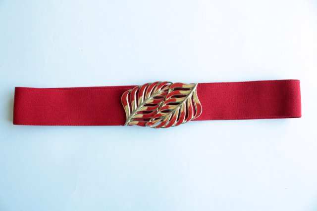 Czerwony pasek z elastycznej gumy, zapinany na ozdobną klamrę.