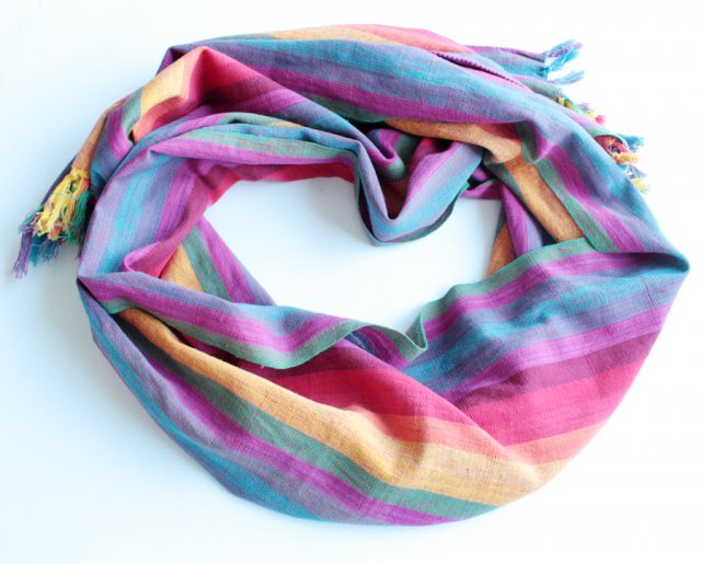 Grubo tkany szal w nasyconych kolorach. Kolory są mocniejsze niż na zdjęciu.