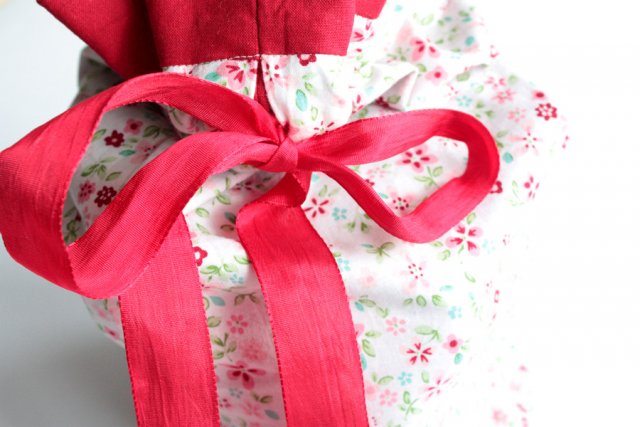 Uroczy, praktyczny woreczek w kwiatki na czerwonej podszewce. Woreczek jest bardzo ładnie uszyty, bez widocznych szwów (są ukryte między warstwami materiału). Może służyć jako element wystroju wnętrz, organizacja przestrzeni lub wyposażenie torby podróżnej. Ściąganie na górze za pomocą czerwonej wstążki.