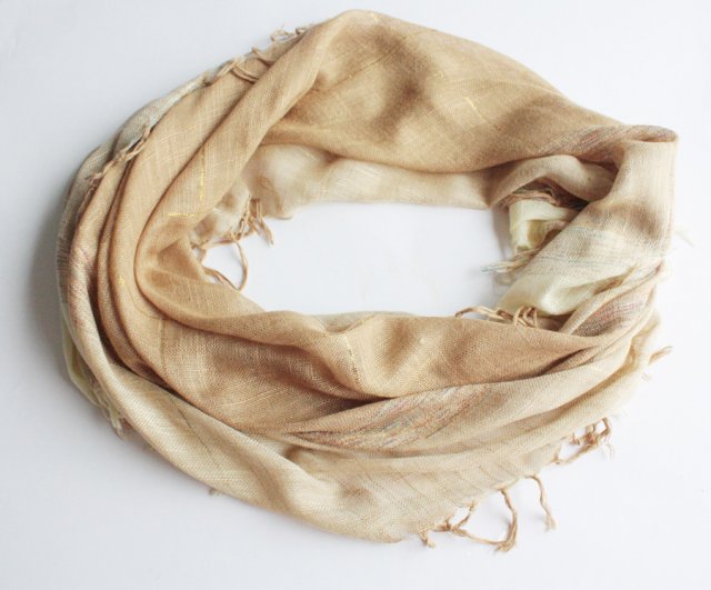 Miękka w dotyku, luźno tkana chusta w różnych, przelewanych odcieniach beżu. Miejscami przetykana bardzo subtelną, złotą nitką.